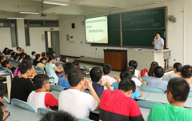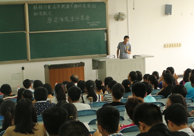 综合楼C座406教室成功举行。全国五一劳动奖章获得者、我院2005届知名校友唐志海先生,院长何有节教授,党委副书记刘晓虎副教授,2013作为出席了本次论坛,我院2013级与2014级轻化工程专业学生参加了此次活动。论坛由刘晓虎副书记主持。唐志海先生结合自身实际发表了务实精彩的演讲。唐志海简短地介绍了在NT动漫