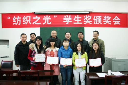3月7日,我院在纺工楼隆重举行了2013年度“纺织之光”学生奖颁奖会,我院及纺织与服装工程系领导、教师,学生代表等加了该会,并2013年度获奖的研究生尚娇娇、杨月双、本科生史婷、尚丹、马勤5位同学颁发了获奖证书。会上纺织系教工支部书记陈衍夏教授向获奖同学表示热烈的祝贺,并介绍了“纺织之光”科教奖的背景、意义及影响;学院党委赵毅书记阐述了人才培养与国家发展的关系,勉励同学们向更高的目标迈进;兰建武副院长宣读了中国纺织工业联合会有关“纺织之光”奖的颁奖文件。