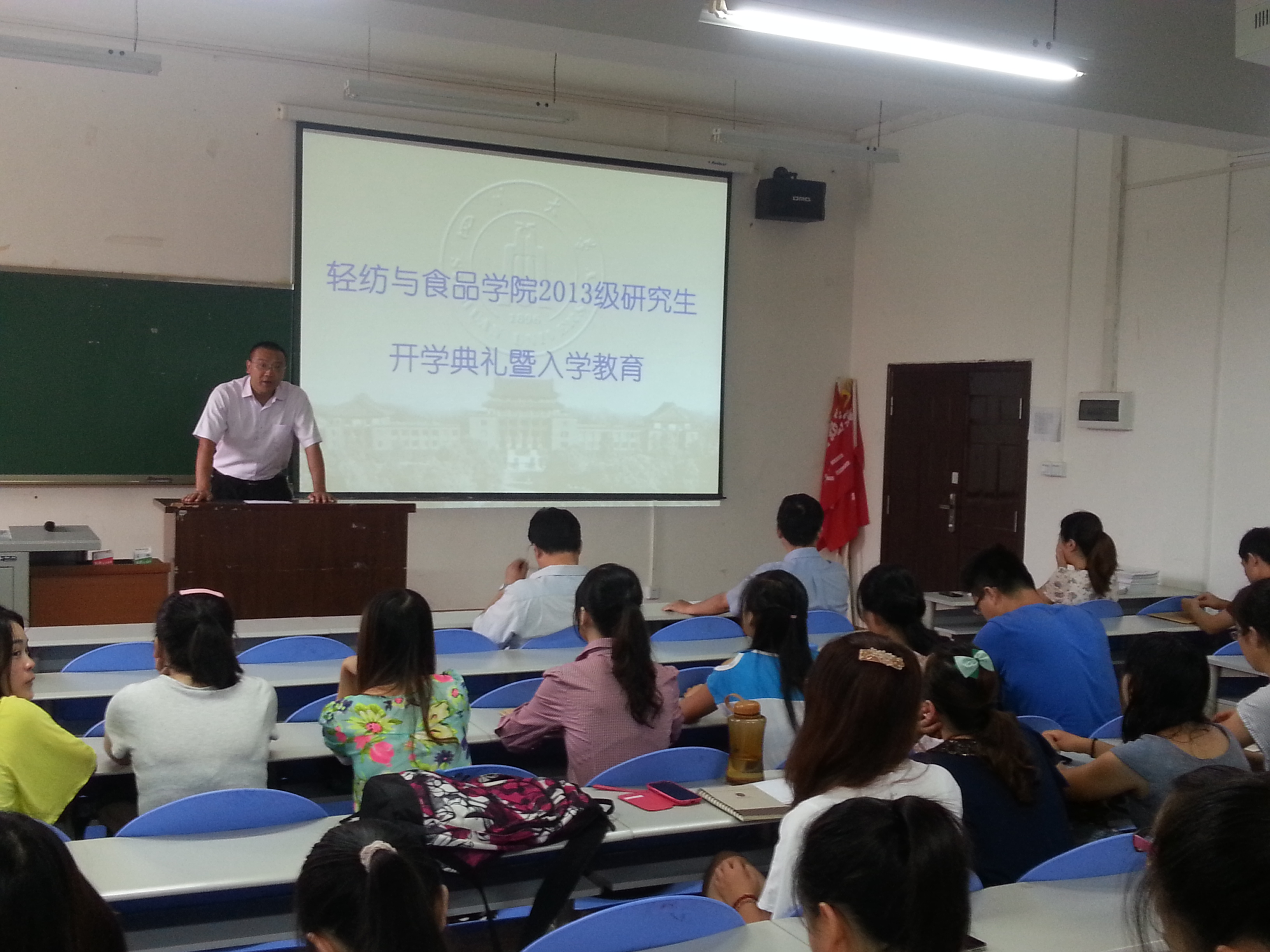 的发展历史,轻纺与食品学院的学科设置、师资队伍、人才培养、科学研究、对外交流及学生活动等方面进行了全面的介绍,让2013级研究生新生对学院有了更全面、深刻的认识,并为在这样的团队中学习感到自豪与骄傲。兰建武院长就研究生的学术诚信、授位要求、中期考核分流、研究生第二次奖助学金的评比、公派研究生项目等给新生作了介绍。开学典礼结束以后,在学院主管学生工作书记刘晓虎副教授的带领下开展了入学教育。刘书记首先对研究生的管理特点、研究生的党支部与研究生会两大组织做了简要介绍,并对同学们在珍惜学习机会、作好发展规划、加强与导师联系、保持良好心态、关注研究生奖学金评定细则等方面给新同学提出了几点建议。随后,李洁老师就研究生培养计划的制定、选课等学籍问题作了介绍,冯国涛老师就研究生的日常管理、组织建设与近期工作等作了详细安排。至此,2013级研究生的学习、生活已正式拉开帷幕。