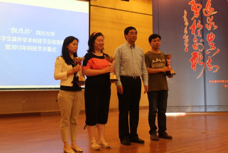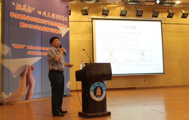 2012年学生课外学术科技活动节总结表彰大会暨2013年学生科技节开幕式在望江校区文华活动中心二楼音乐厅举行。校长谢和平院士,常务副校长李光宪教授,党委副书记李向成教授等领导出席了本次会议。轻纺与食品学院在2012年学生科技节中以总分第六名的优异成绩喜获团体三等奖,院党委副书记刘晓虎副教授作为学院团体获奖代表做工作交流,院团委书记苏德强老师代表学院上台领奖。大会伊始,校团委书记王斌副教授介绍了2012年学生科技节的开展情况和所取得的丰硕成果,校党委副书记李向成教授宣读了《关于表彰在“挑战杯”NT动漫