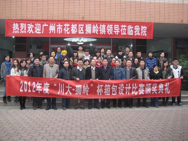 在皮革行业革制品设计方向的人才培养作出的努力表示感谢。罗镇长全面介绍了狮岭镇集箱包的设计、生产、销售、运输为一体的产业集群优势,希望革制品设计方向的有志之士能到狮岭发展,为行业的发展作出更大的贡献。紧接着,刘晓虎副书记宣读了2012年度“川大•狮岭”杯箱包设计比赛的获奖名单,到场的各位领导与嘉宾为获奖同学一一颁奖。最后2009级革制品设计专业冉美玲同学作为获奖学生代表发言。 颁奖典礼结束后,参会领导与嘉宾参观了我院革制品设计教研室及重点实验室,并在皮革楼二楼会议室进行了校-镇合作交流座谈会。至此,2012年度“川大•狮岭”杯箱包设计比赛颁奖典礼及合作交流座谈会取得圆满成功。