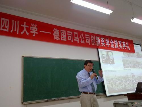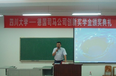 —司马公司创新奖学金颁奖典礼在纺工副楼报告厅隆重举行。参加本次颁奖典礼的嘉宾有德国司马公司首席代表、皮革部中国区张建华经理、轻纺与食品学院党委书记赵毅副研究员、轻纺与食品学院学生工作组苏德强老师。2008级生物质与皮革工程系本科生及全体获奖同学参加了颁奖典礼,本次颁奖典礼由冯国涛老师主持。