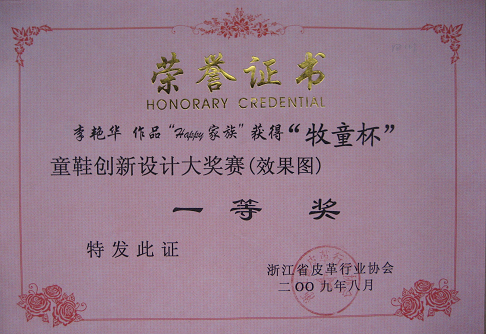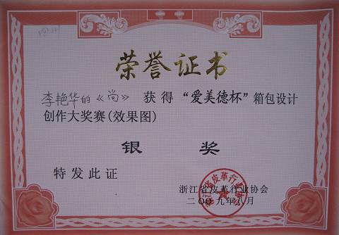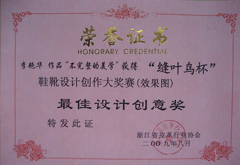 革制品专业方向同学参加首届“缝叶鸟杯”青年鞋靴设计创作大奖赛获奖情况 2009年9月,由浙江省皮革行业协会举办的首届“缝叶鸟杯”青年鞋靴设计创作大奖赛落下帷幕,本次大赛是以投稿的形式参加,吸引了国内众多高校及鞋企设计师的参与,参赛人数众多,比赛竞争激烈。 主办单位经过严格公正的评比,于最近公布了比赛结果:我系革制品设计专业方向2006级学生李艳华以三张作品分别获得了大奖赛效果图类的一等奖和银奖以及最佳设计奖。(姚云鹤供稿) 附参赛作品及证书: