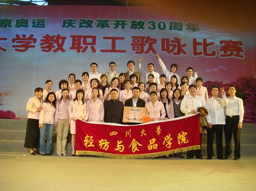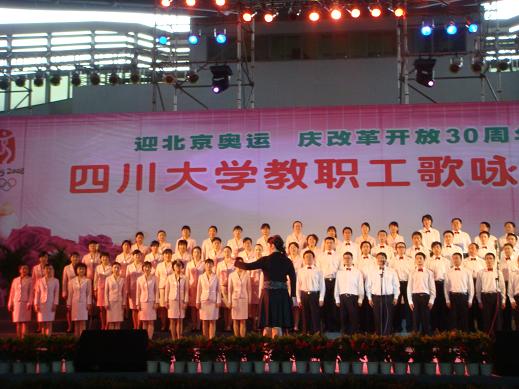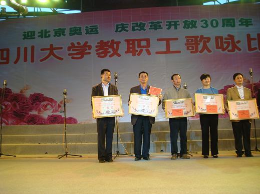 “迎北京奥运、庆改革开放30周年”教职工歌咏比赛在我校体育中心隆重举行。学校党政部分领导和校工会领导出席了歌咏比赛,比赛共设特等奖1名,一等奖3名,二等奖8名,三等奖19名,全校共31个单位参加了此次比赛。在学院党政领导的大力支持下和院工会精心组织下,我院教职代表队热情饱满地参加了比赛。当《同一首歌》在场内响起的时候,评委和观众席内爆发出阵阵热烈的掌声,也充分展示了我院教职工风采和团结协作的精神。最后,我院教职工代表队荣获二等奖,后勤集团教职工代表队获得特等奖,校机关、成人与网络教育、华西口腔医学院教职工代表队获得一等奖。特别需要指出的是,我院参赛教职工和学院领导至始至终坚守在观众席上,倾听其他队伍的演唱,表现出良好的纪律性。