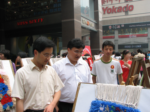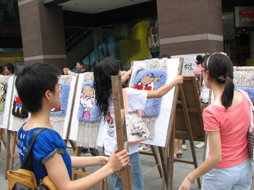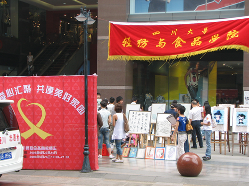 轻纺与食品学院纺织服装系和四川师范大学联合举办的“抗震救灾 情系汶川”师生作品义卖活动在红星路步行街第一城举行,两校师生无偿捐献出自己的专业作品,这次义卖活动筹款4万多元全部上交四川慈善总会捐献给了灾区人民。 我们纺织工程专业在教研室组织下,由赵敏老师带领积极参加了这次义卖活动。赵敏老师捐出多幅自己的蜀锦作品,同学捐出完成专业课作业的作品――纯手工编织的工艺挂毯,更有兰井波、吴娟、杨燕、张芳、薛清华、赵玲等同学用自己的获奖作品参加了义卖活动。大家齐心协力,只希望可以多为灾区的同胞们多筹集哪怕是一元钱。 我们的活动在学院、学校领导支持下,在老师同学的努力下取得了圆满成功。轻纺学院师生的作品义卖得到2万1千元,其中纺织工程筹得6468元。赵敏老师的大幅蜀锦《念奴娇·赤壁怀古》及《太阳神鸟》三幅共筹得2368元,其中蜀锦《念奴娇·赤壁怀古》拍得2008元,是这次义卖活动筹款最高的作品。兰井波、陈虎章和刘余魏同学的第二届NT动漫