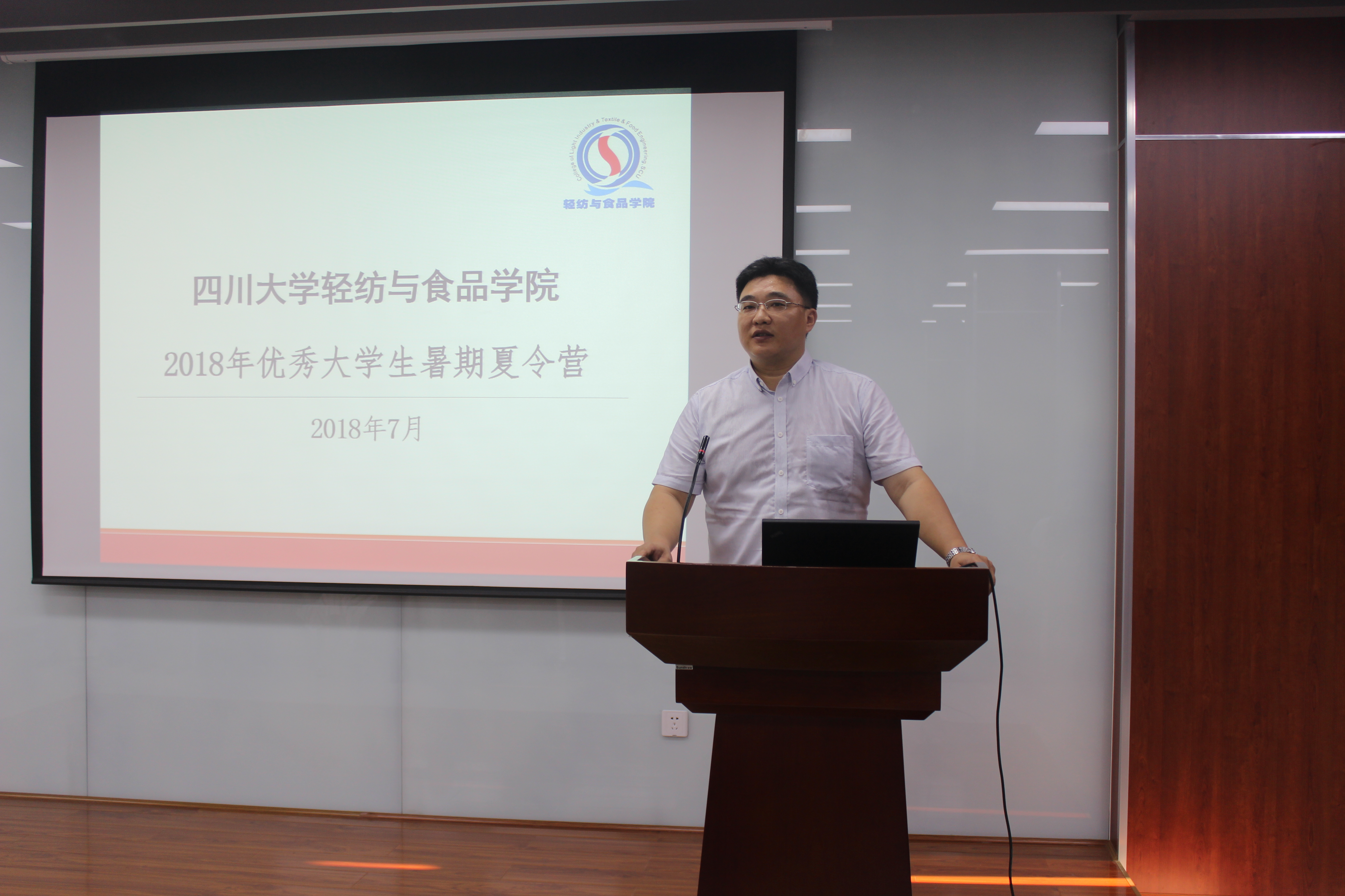 开营仪式于2018年7月23日上午8:30在皮革楼报告厅举行,参加本次开营仪式的有轻纺与食品学院党委书记刘晓虎副教授、副院长何强教授、国家级教学名师陈武勇教授、纺织与服装工程系系主任郭荣辉副教授、生物质与皮革工程系副系主任杨璐铭副教授、食品工程系副系主任迟原龙副教授以及学院党政办主任李慧老师、辅导员贺婷老师。首先,刘晓虎书记代表学院党政对来自全国各高校的44位营员表示热烈欢迎,并对为本次夏令营举行付出辛勤努力的各位老师表示感谢;同时,刘书记介绍了我校作为双一流建设A类高校,我院也积极牵头先进轻工技术与环境保护一流学科平台建设,在此平台上,我们更需要优秀的研究生生源为双一流建设贡献力量。最后,刘书记对所有营员提出三点希望:一是要珍惜本次交流学习机会,加强对我校学科的了解,并与兄弟学校同学们加强交流,取长补短;二是为共同举办好本次夏令营,请所有营员一定遵守学校的管理规定,安全有序举办好每一项活动;三是预祝同学们在此渡过愉快的时光,同时也预祝夏令营活动圆满成功。接下来,何强副院长从学校、学院的历史沿革,学院学科建设、师资队伍、科研平台以及国际交流等方面作了详细的介绍,让同学们对学校、学院的整体情况有了较为全面的了解。