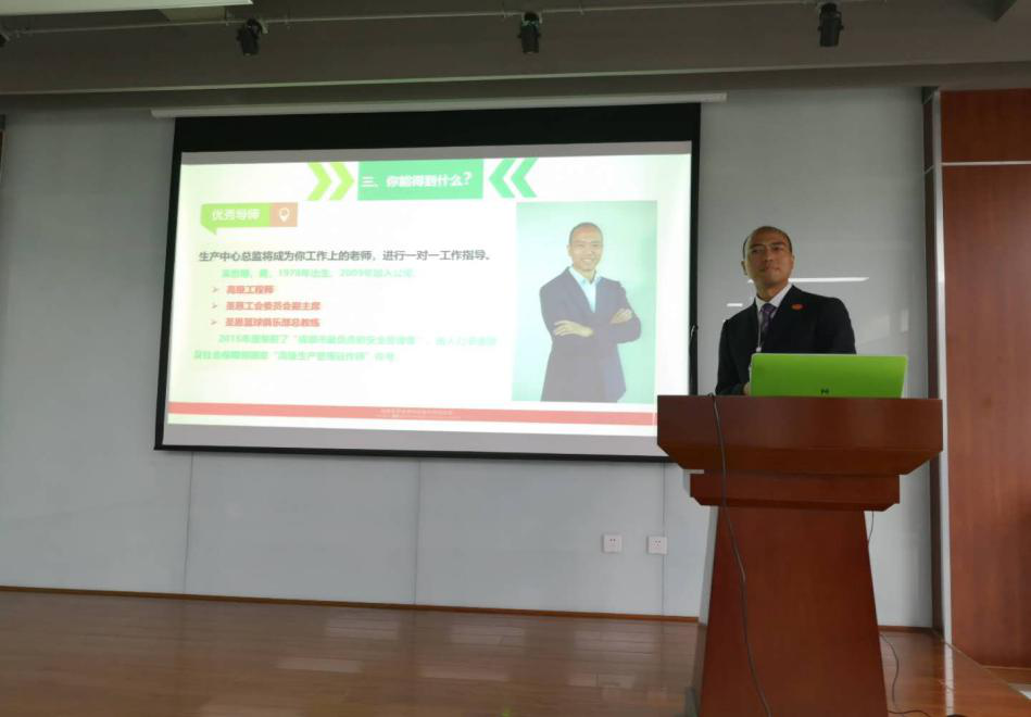 生产部总监吴世明先生通过对行业前景、生产中心简介、学习和收获、成长平台和发展方向4个维�详细深入的讲�,让同学们全方面的了解了圣恩生产部的情况�产业发展上所取得的成就和广阔发展前景,求贤若渴的诚挚之情点燃了在场学子的激情�