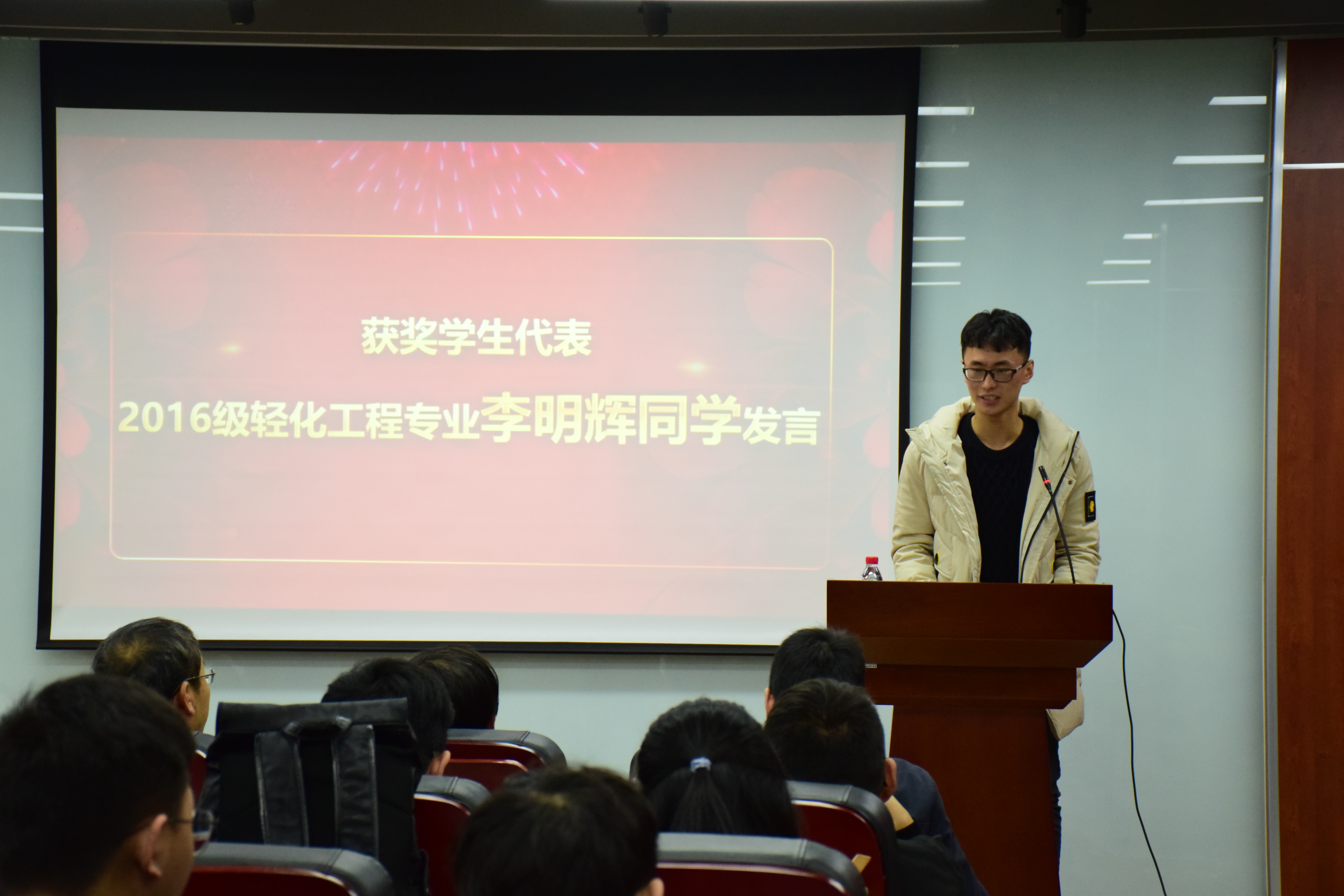 随后,轻纺与食品学院党委副书记冯国涛老师宣读了�关于表彰轻纺与食品学院生物质与皮革工程系2018年度优秀个人、优秀班级的决定���隆重的颁奖音乐中,学院领导及与会嘉宾为获奖同学一一颁奖并合影留念�最后,获奖学生代表�2016级轻化工程专业李明辉同学发言,表达了对设奖单位的感谢,对学院生物质与皮革工程系长期的培养与教育表示谢意,并表示一定以此为新的起点,继续努力,取得更优异的成绩回报行业、社会以及学校�