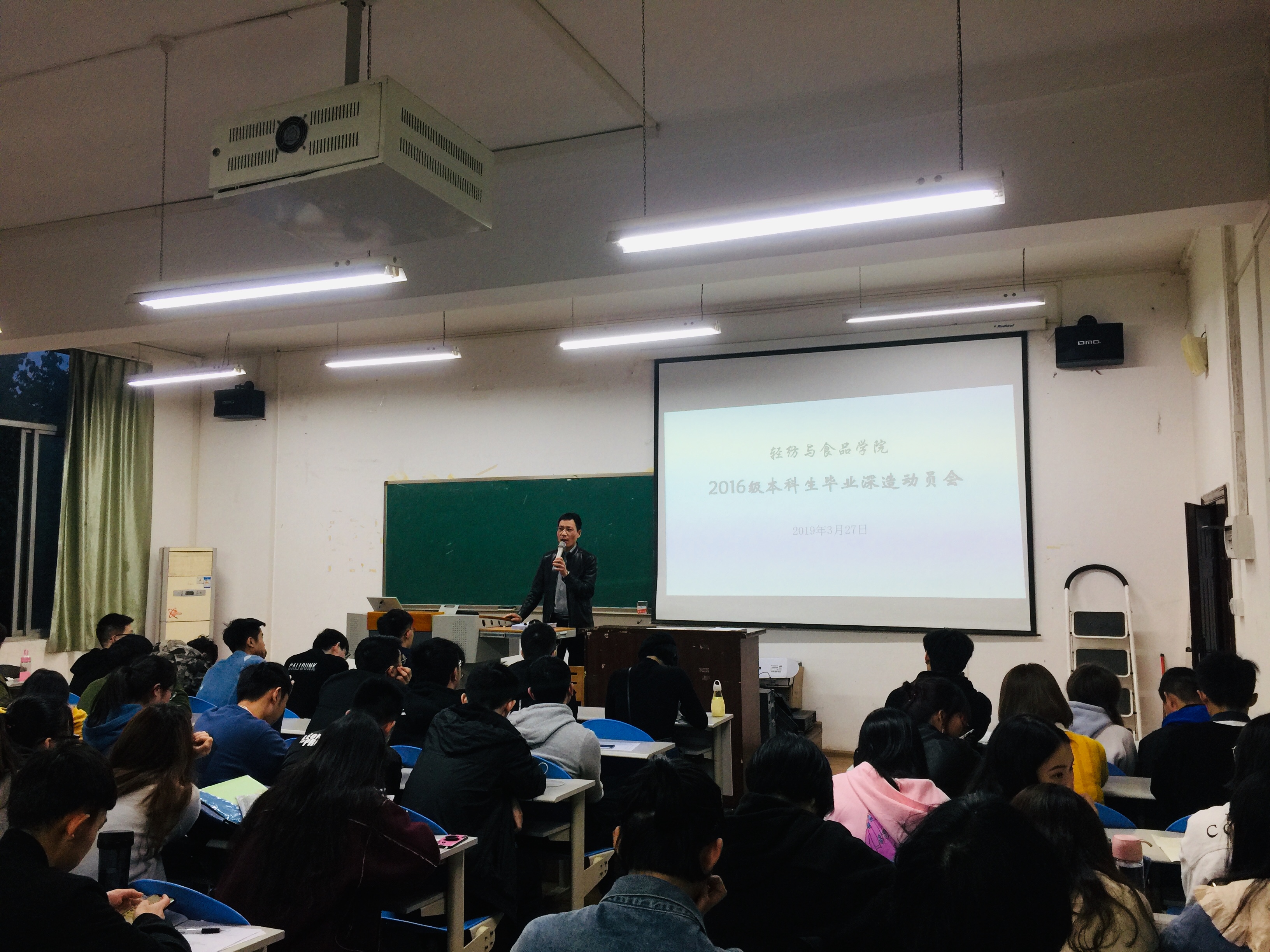 为提高学院本科生深造率,动员学院2016级学生作好深造计划,并为学院下一步加强深造精准指导提供基础,我院于2019年3月27日晚19时在纺工附楼205教室举行了2016级本科生深造动员大会。本次深造动员大会由轻纺与食品学院党委副书记冯国涛老师主讲,2016级本科生辅导员王舒灏老师以及2016级全体学生到场参加了动员大会。