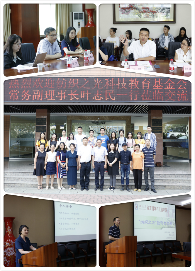 与我院的基本情况、成果与发展等进行了简要介绍;叶志民副理事长也介绍了“纺织之光”基金会的由来和发展情况,说明了此次回访考察的重要目的和意义。近两年我院获“纺织之光”教师奖施亦东副教授、陈胜副教授分别介绍了自己的获奖心得,以及从事纺织教育、科研的经历与感悟,对未来征程许下“不忘初心,砥砺前行”。后续交流中,叶志民副理事长、白静副秘书长与到场教师们、同学们进行了互动式现场交流,并仔细了解了历年获奖学生的成长与发展情况。