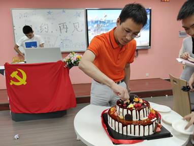 组织生活最后,为了庆祝大家顺利毕业和党支部的成长,党支部支委们为大家定制一个蛋糕,由冯国涛副书记为大家切蛋糕,党支部成员们一起吃蛋糕并相谈甚欀�