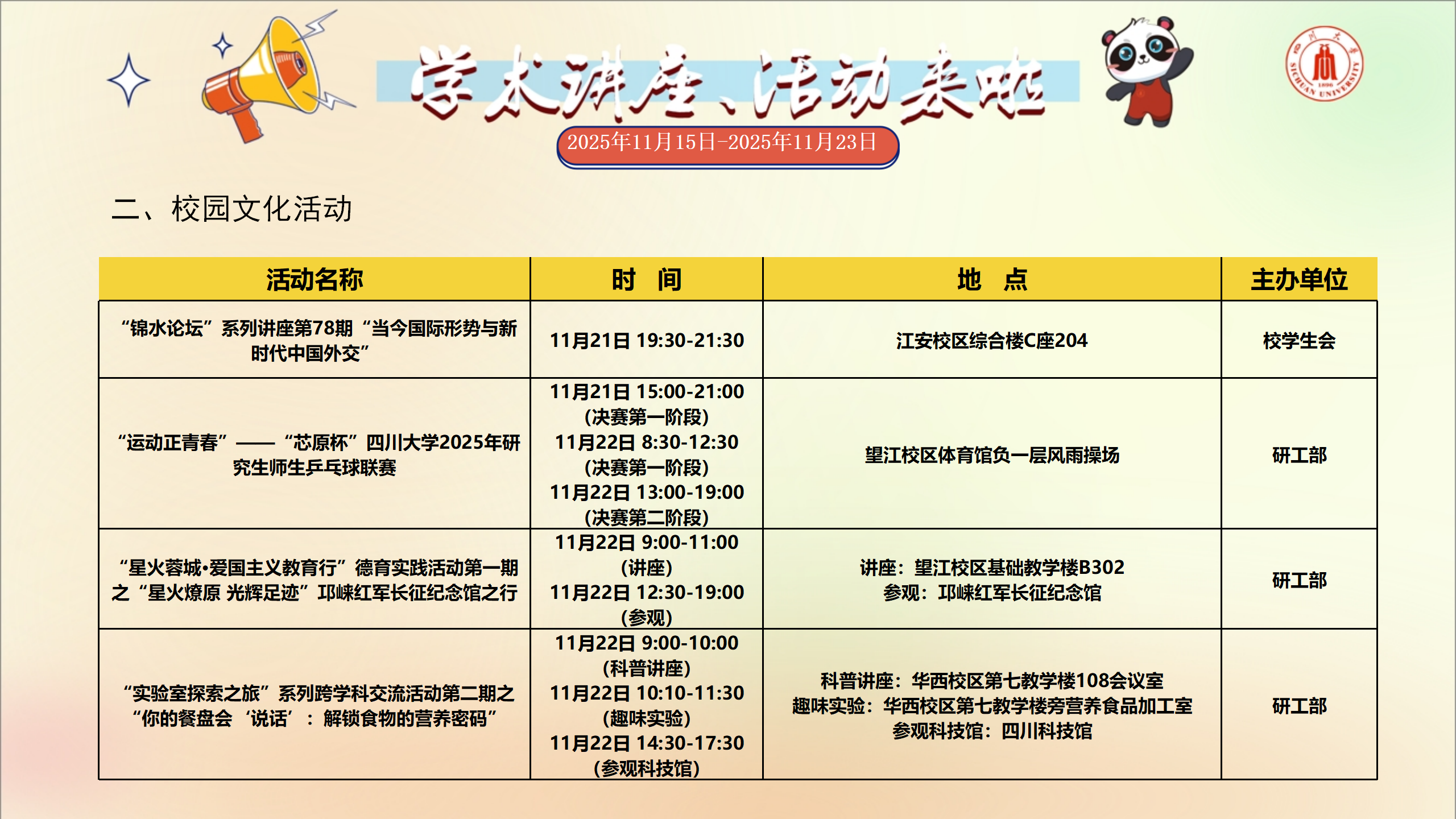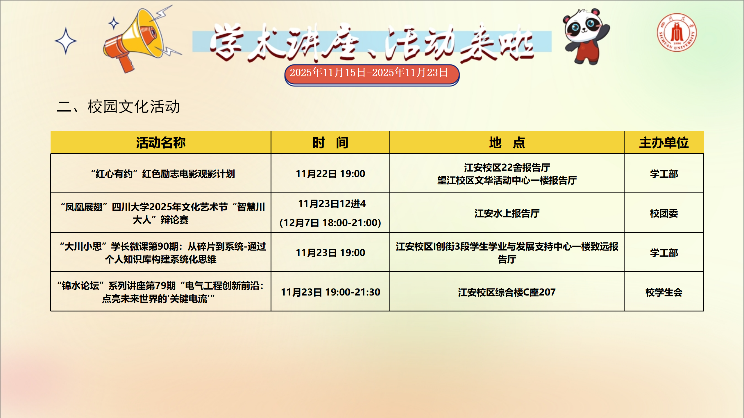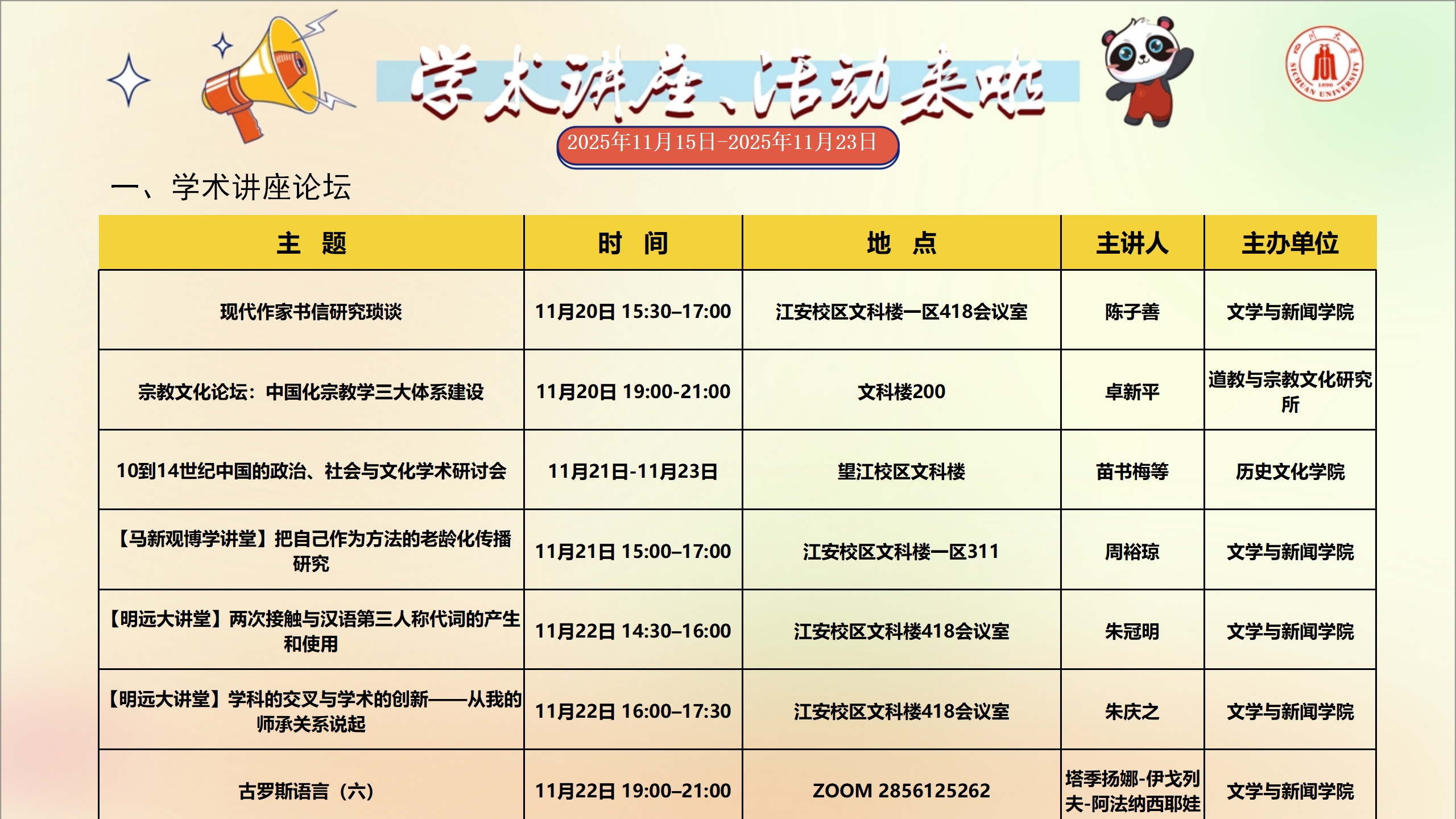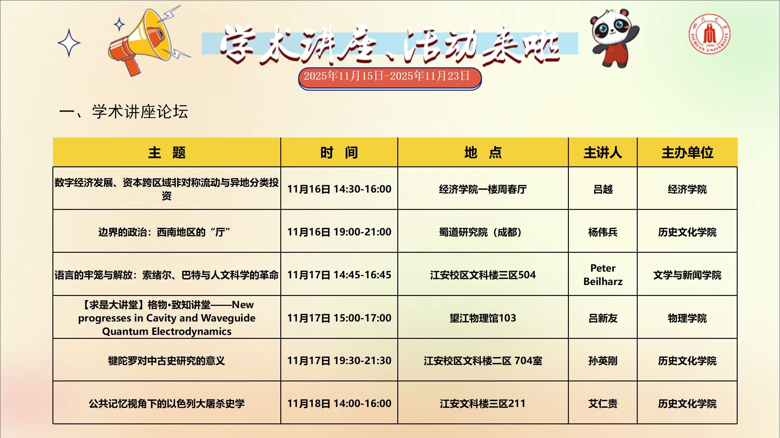 学术讲座和校园文化活动预告(2025年11月15日-2025年11月23日)