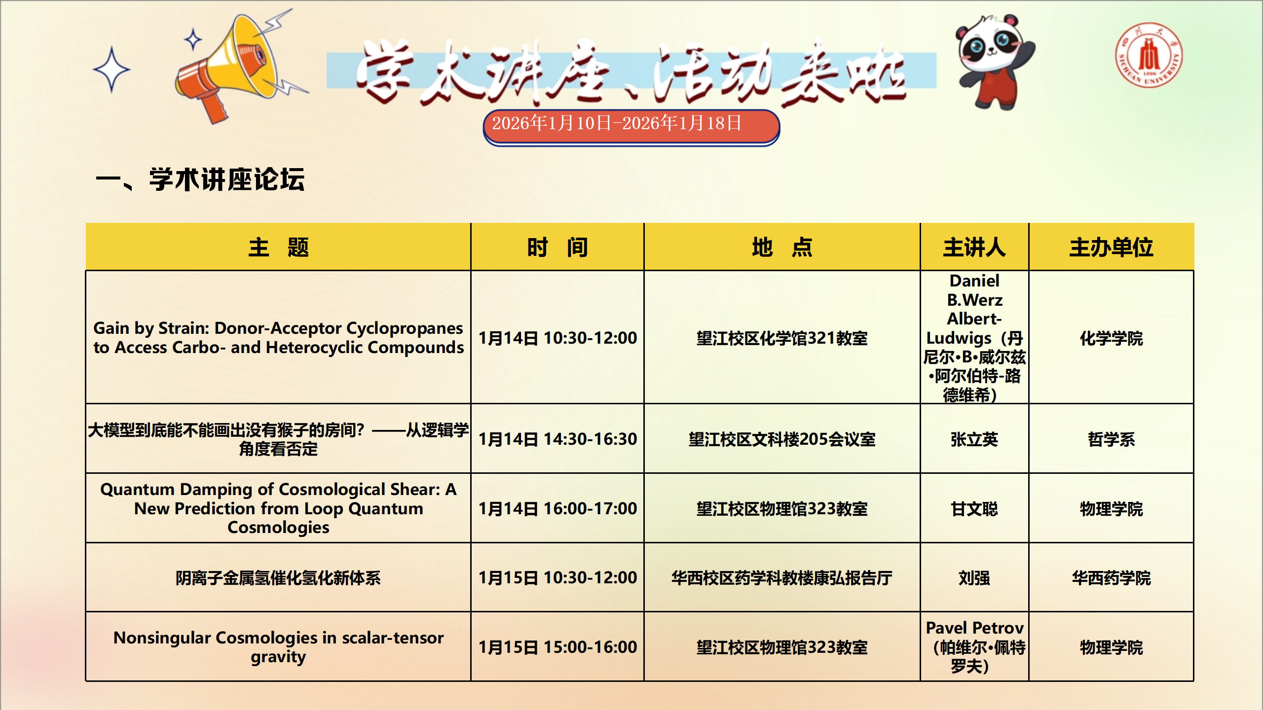 学术讲座和校园文化活动预告(2026年1月10日-2026年1月18日)