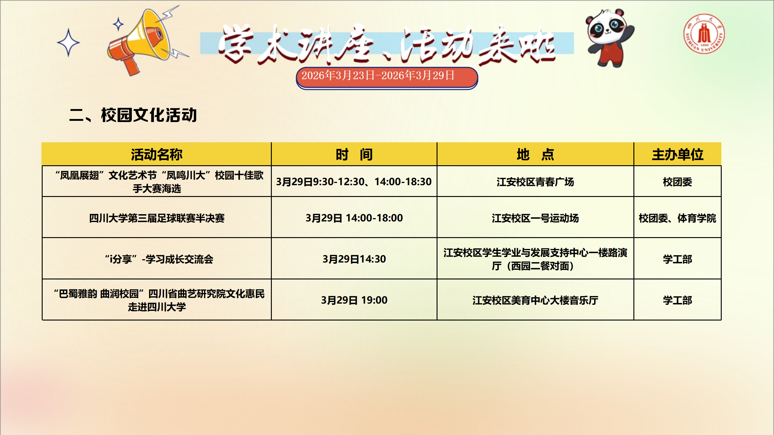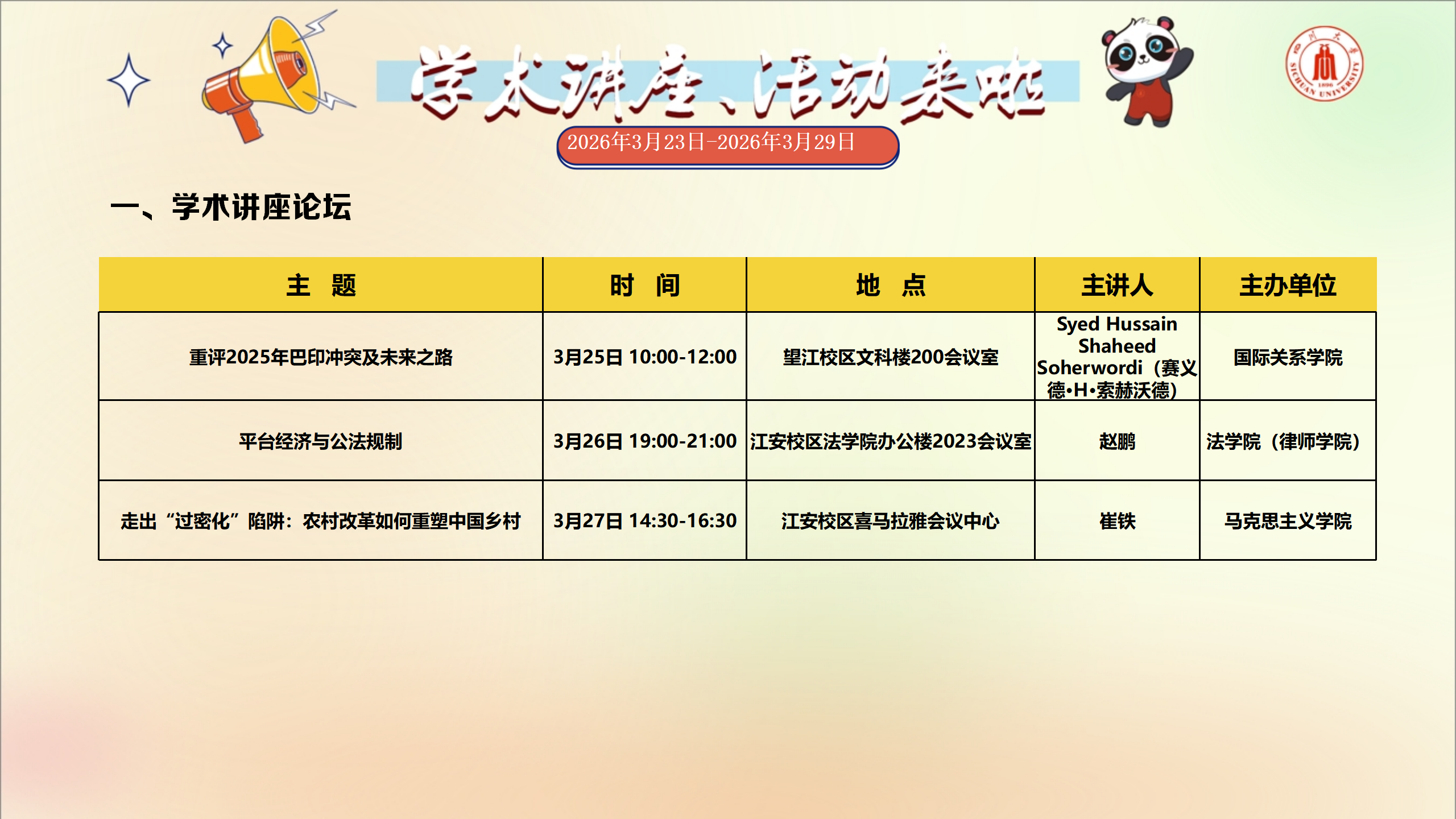 学术讲座与校园文化活动预告(2026年3月23日-2026年3月29日)