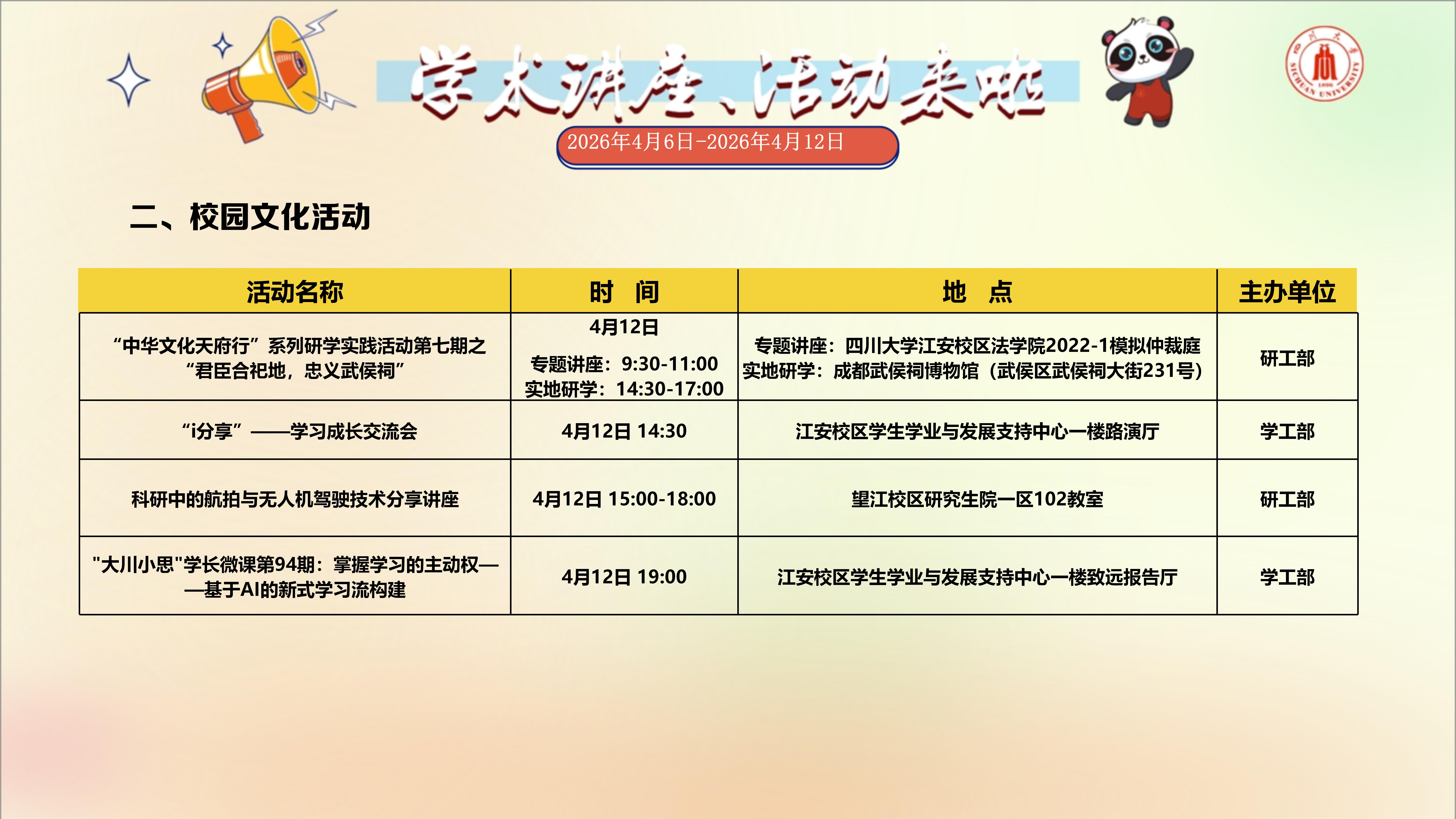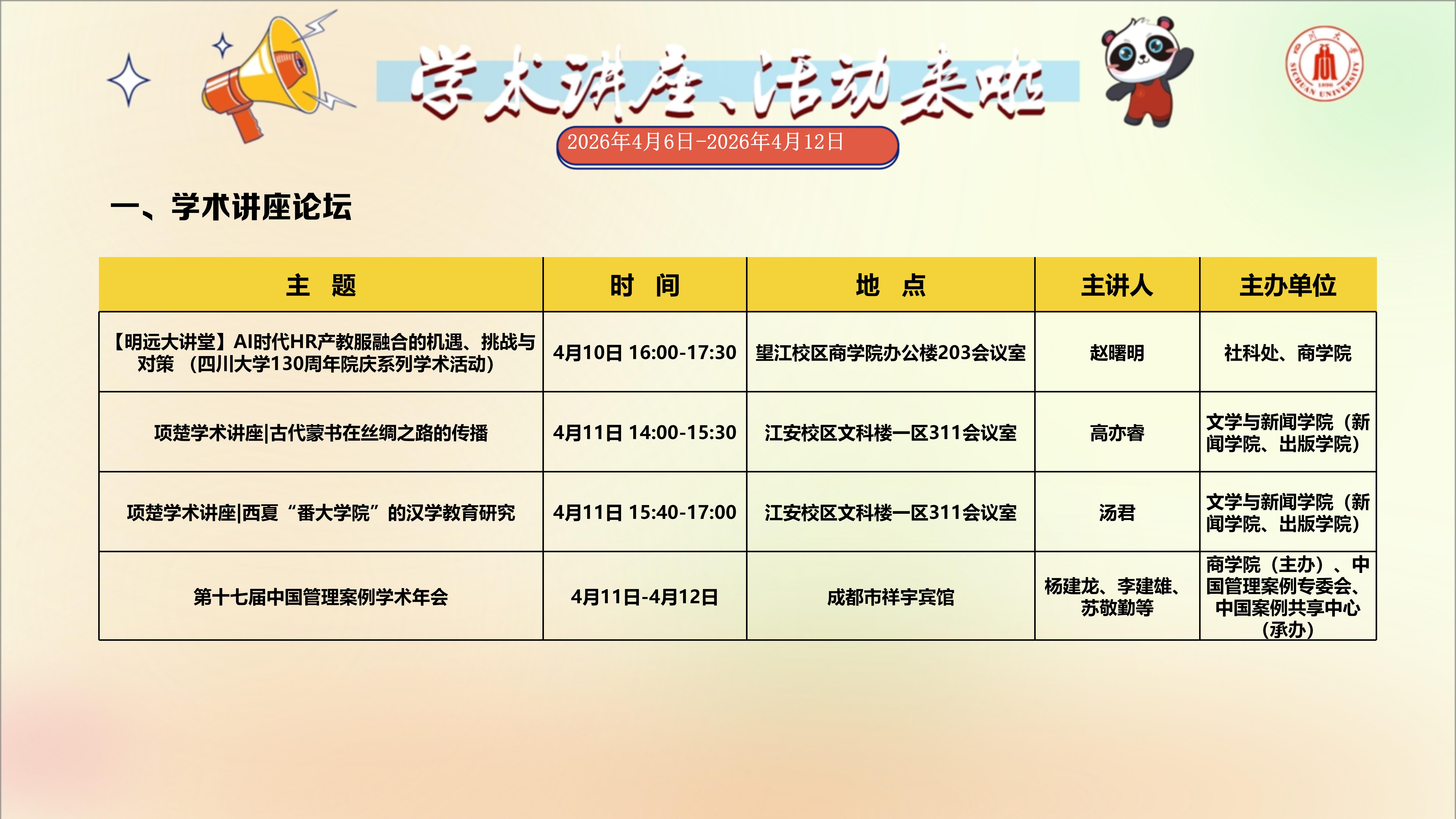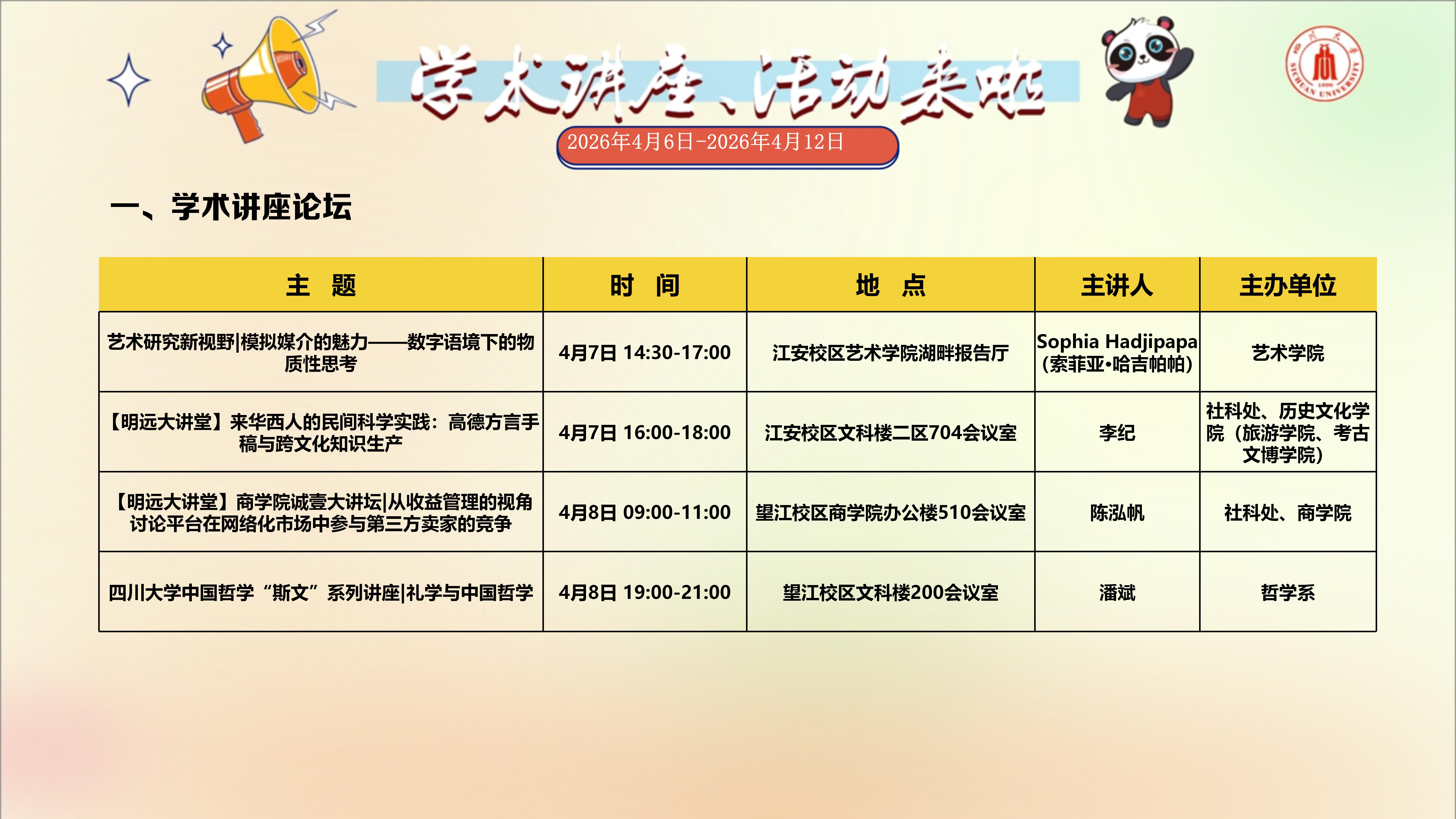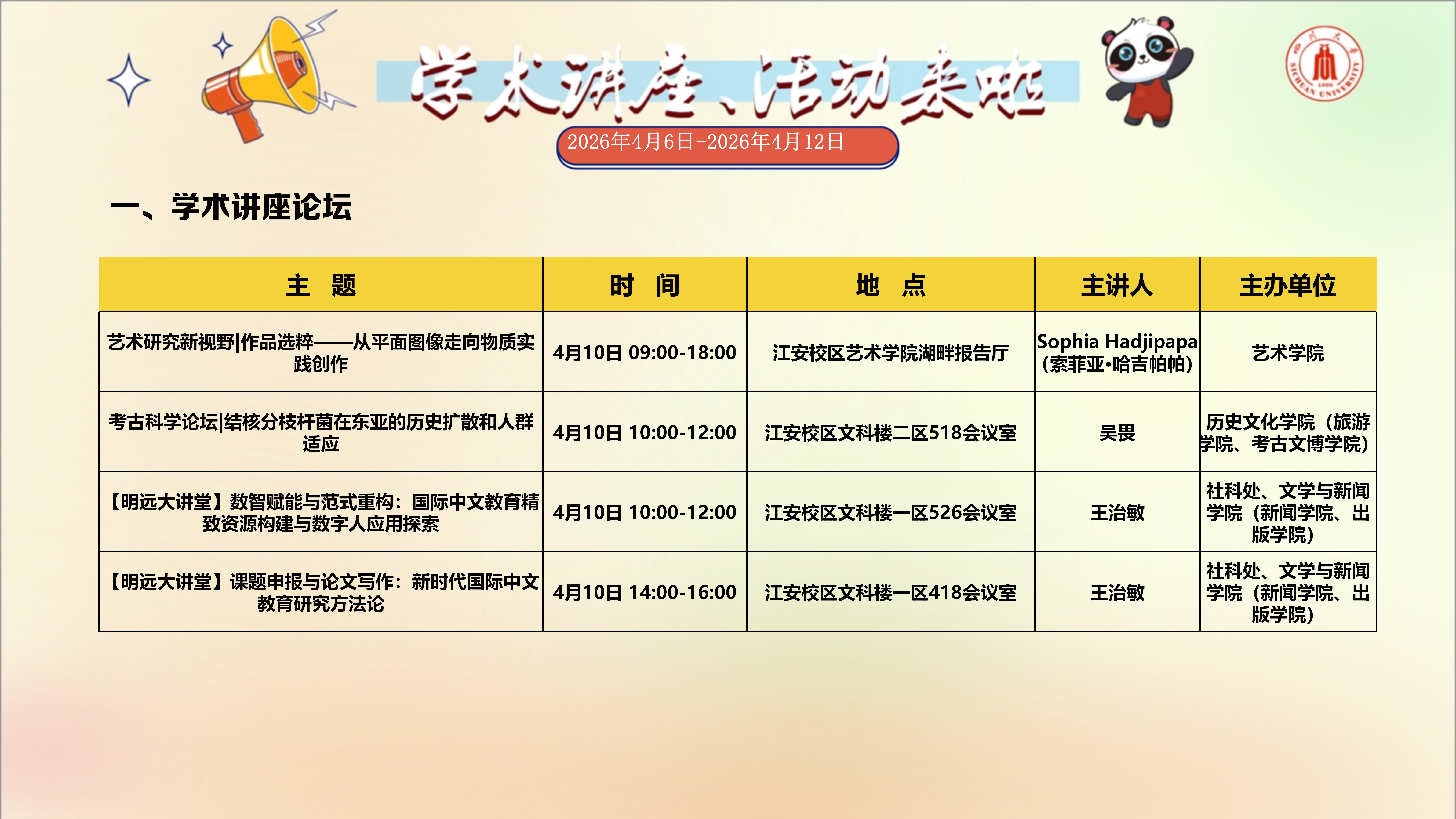 学术讲座与校园文化活动预告(2026年4月6日-2026年4月12日)
