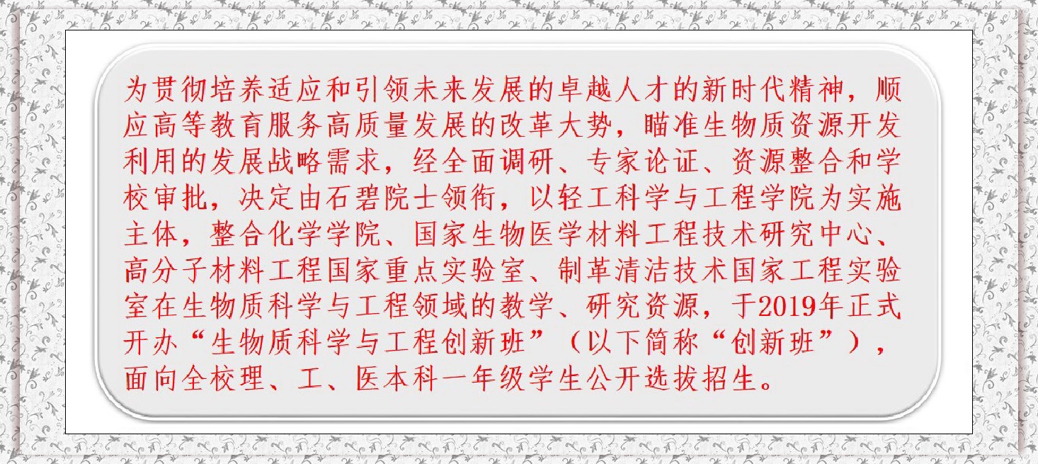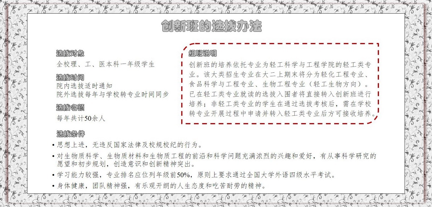 一、生物质科学与工程创新班2020�选拔条件、考核方案、操作指南详见教学处通知。(点击去往�