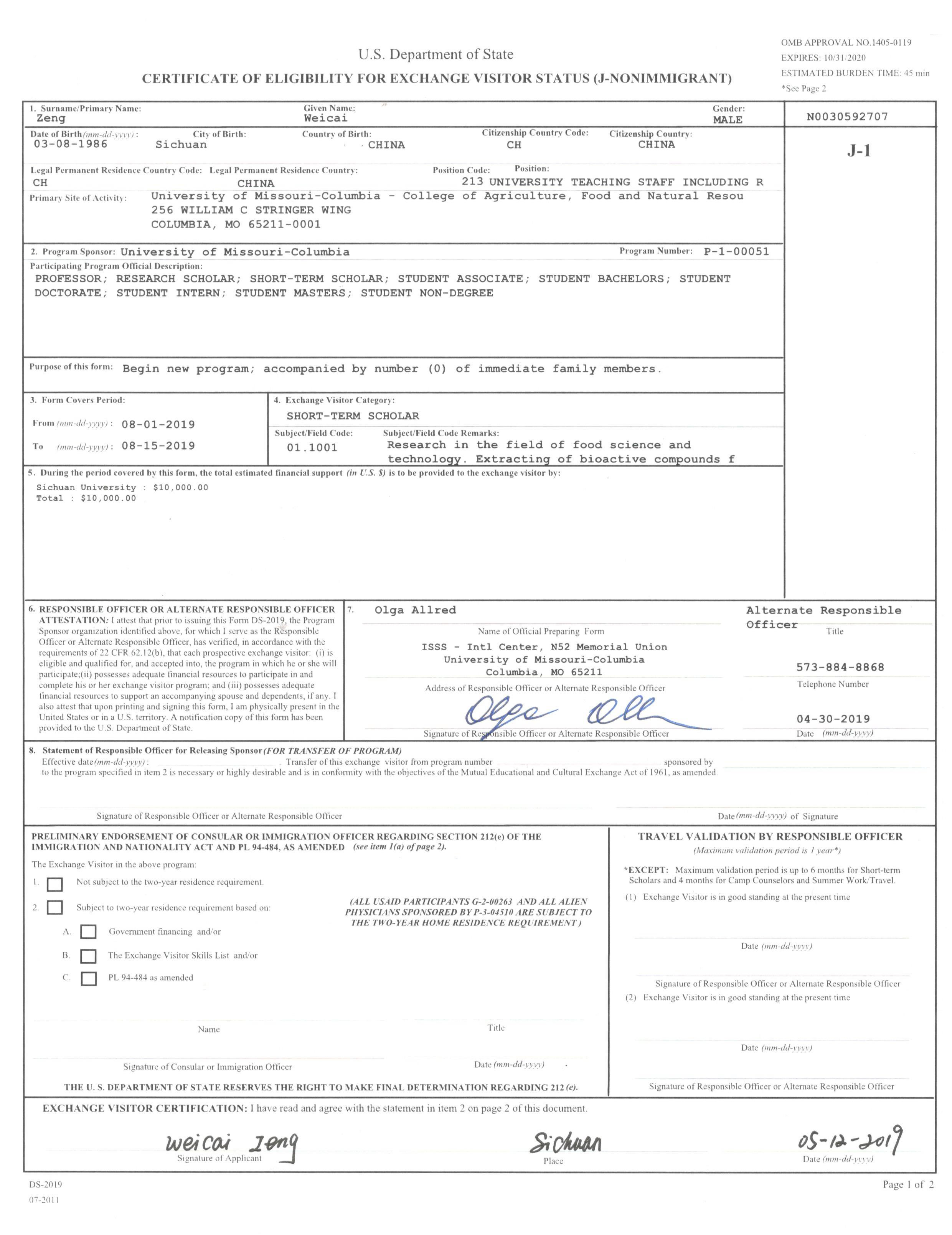 应密苏里大学(University of Missouri)的邀请,曾维才副教授将于2019年8月1日-15日赴美国(日程15天,增加邀请函公示),参加“2018年四川省国际合作项目”的科学任务与交流和商谈“中美2+2联合办学项目”事宜,经费来源为科研经费,往返路线为:成都-密苏里-成都。