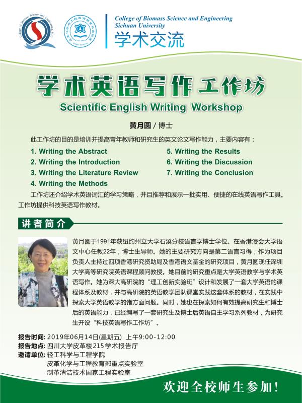 为强化青年教师全英文授课的基础能力和提升研究生英文论文的写作水平,现邀请到香港浸会大学黄月圆博士,于2019年6月14日(周五)上午9:00-12:00,在NT动漫 望江校区皮革楼215学术报告厅,以工作坊的形式开展学术英语写作培训,欢迎全校青年教师、研究生参与学习!