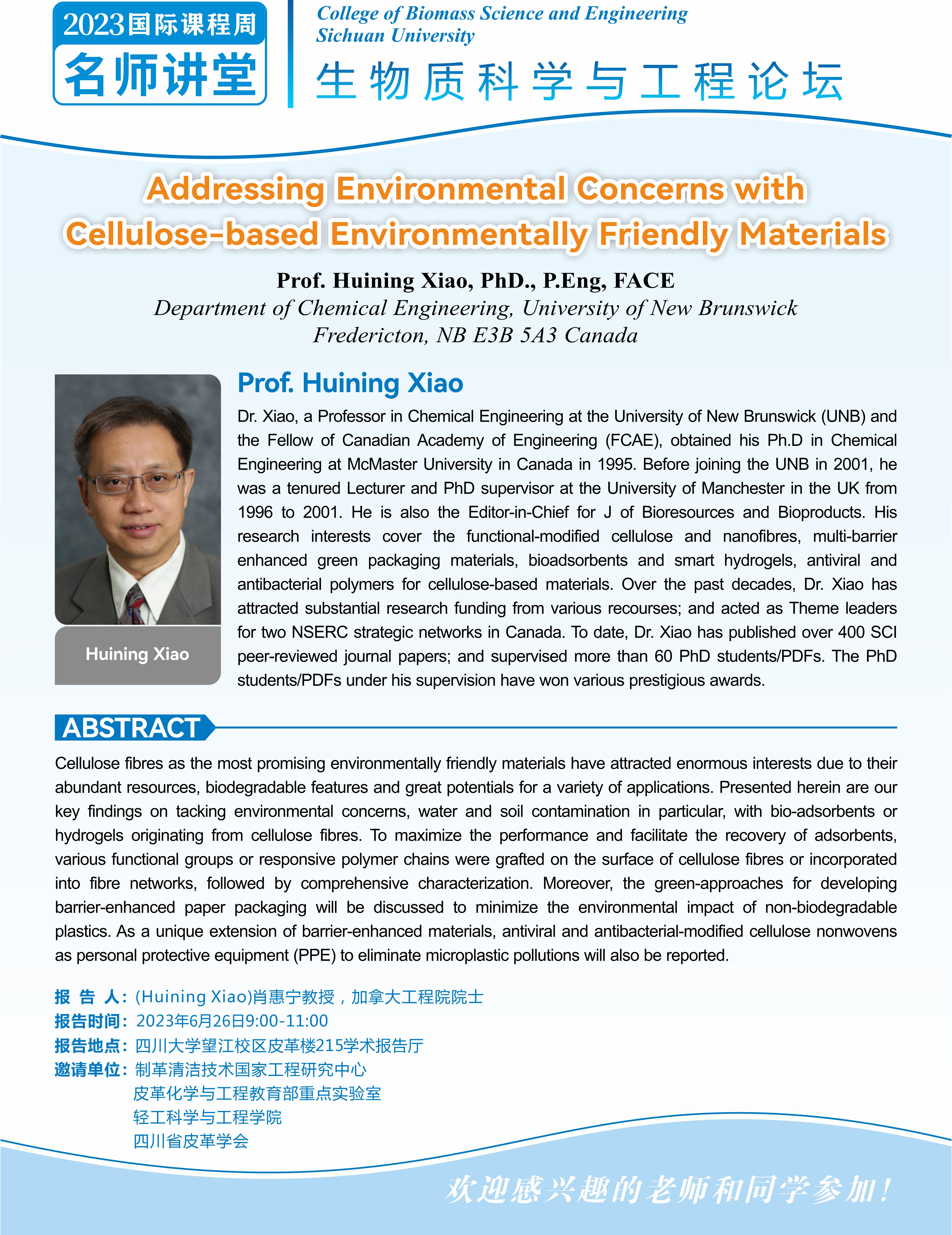生物质科学与工程论坛:Huining Xiao教授 学术报告