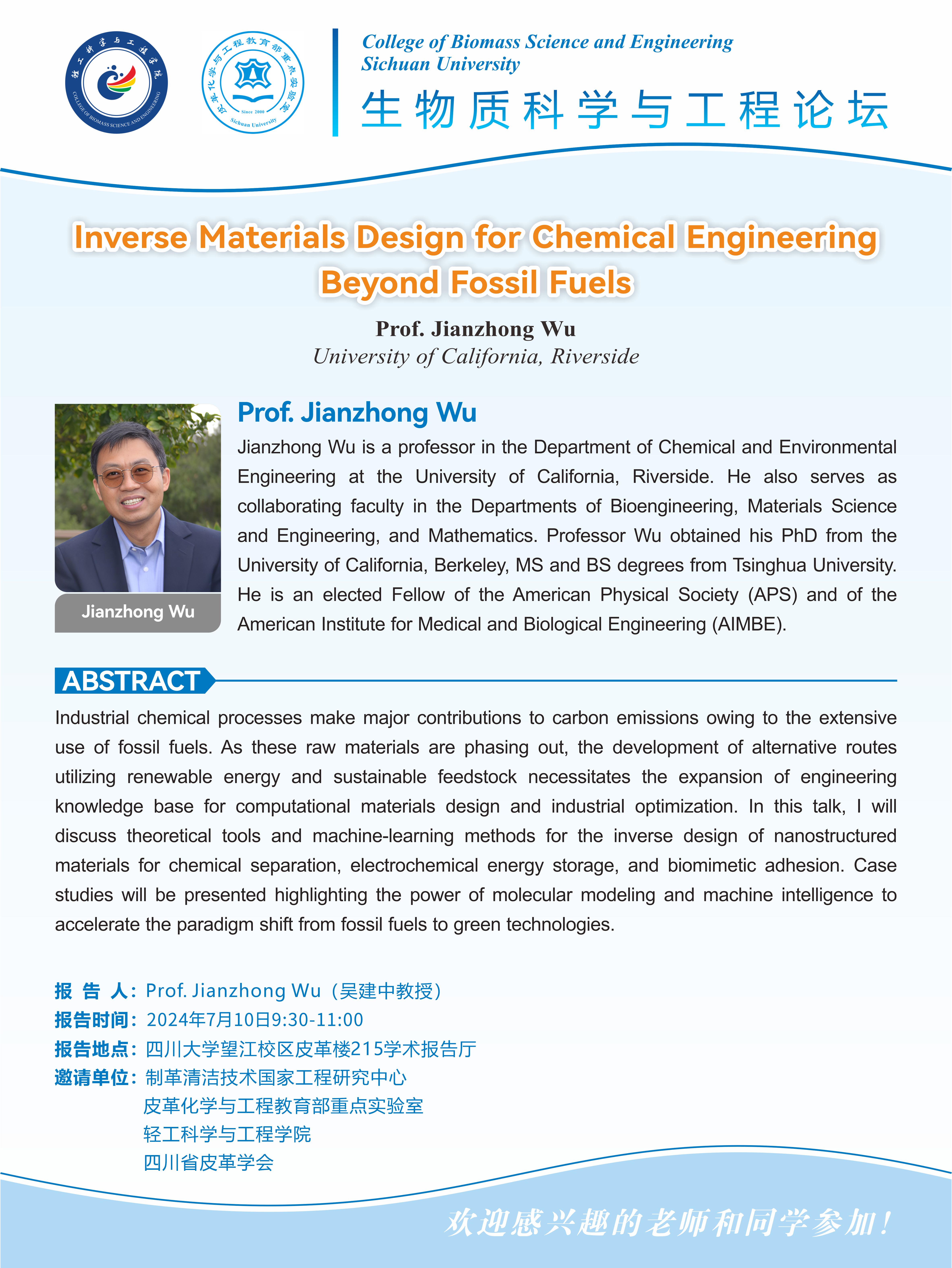 生物质科学与工程论坛:Jianzhong Wu教授 学术报告