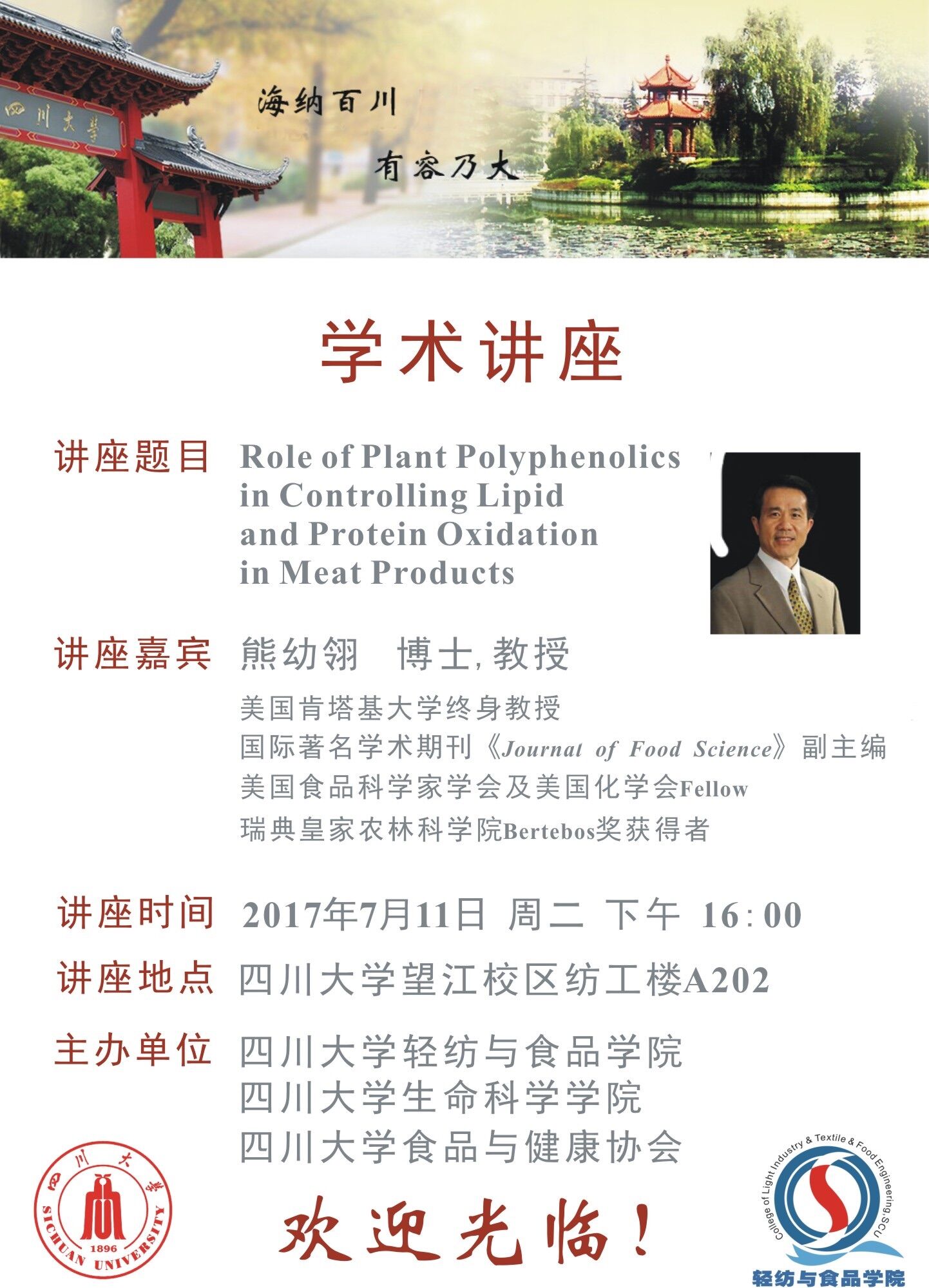 报告题目:Role of Plant Polyphenolics in Controlling Lipid and Protein Oxidation in Meat Products 报告人:美国肯塔基大学熊幼翎博士教授 报告时间:2017年7月11日(星期二)下午16:00 报告地点:NT动漫