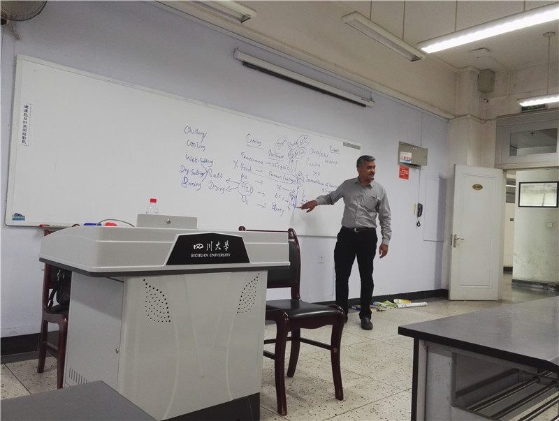 江安校区一教D103教室给选课的本科生首先简单介绍了自己以及主要研究方向和本课程主要内容。在确认自己的语速能保证同学们听懂后,了解了同学们的专业基础。在课堂上,Thanik强调“What”“How”和“Why”,注重提高同学们的逻辑思维能力,从简单的问题出发,循循善诱,启发大家思考,激发同学们的学习热情、鼓励大家大胆表达;对同学们的十分关心的清洁化制革方法、动物保护等问题,认真倾听并结合自己多年的研究成果和教学经验进行了仔细的讲解。Thanik教授严谨的科学思维和注重启发思考的教学方式给同学们留下了深刻的印象。据悉,此次川大行将持续至7月15日。在此期间,Thanik教授还会继续介绍鞣前工段的理论和机理以及原料皮蛋白质理论和鞣制机理。通过此次“实践与国际课程周“活动,我院轻化工程专业的本科生对原料皮的保存理论和机理有了更清晰的认识,对保存方法有了更深刻的记忆。与此同时,在Thanik的引导下,同学们敢于并乐于表达,扩充了专业知识并且提高了专业英语应用水平,促进大家积极思考,以机理为出发点更好地理解制革中的一些问题。