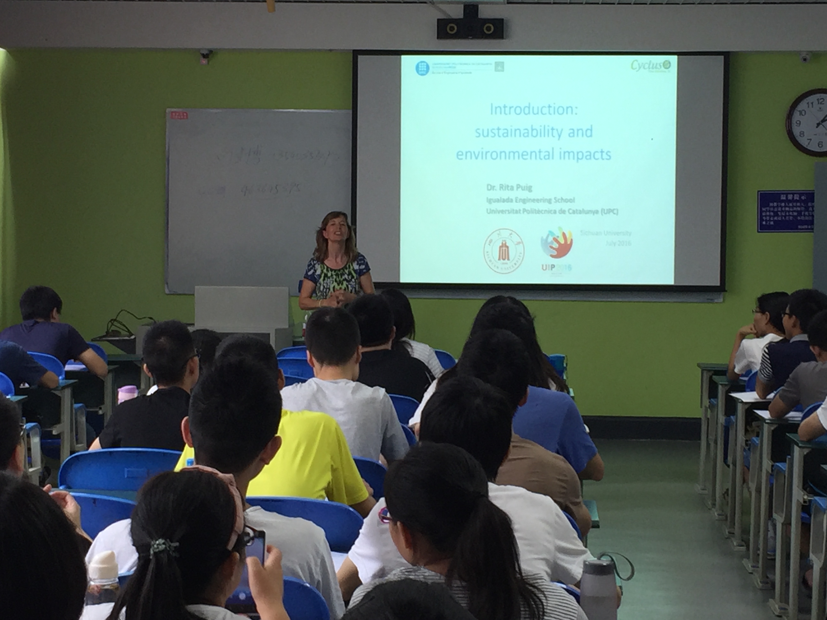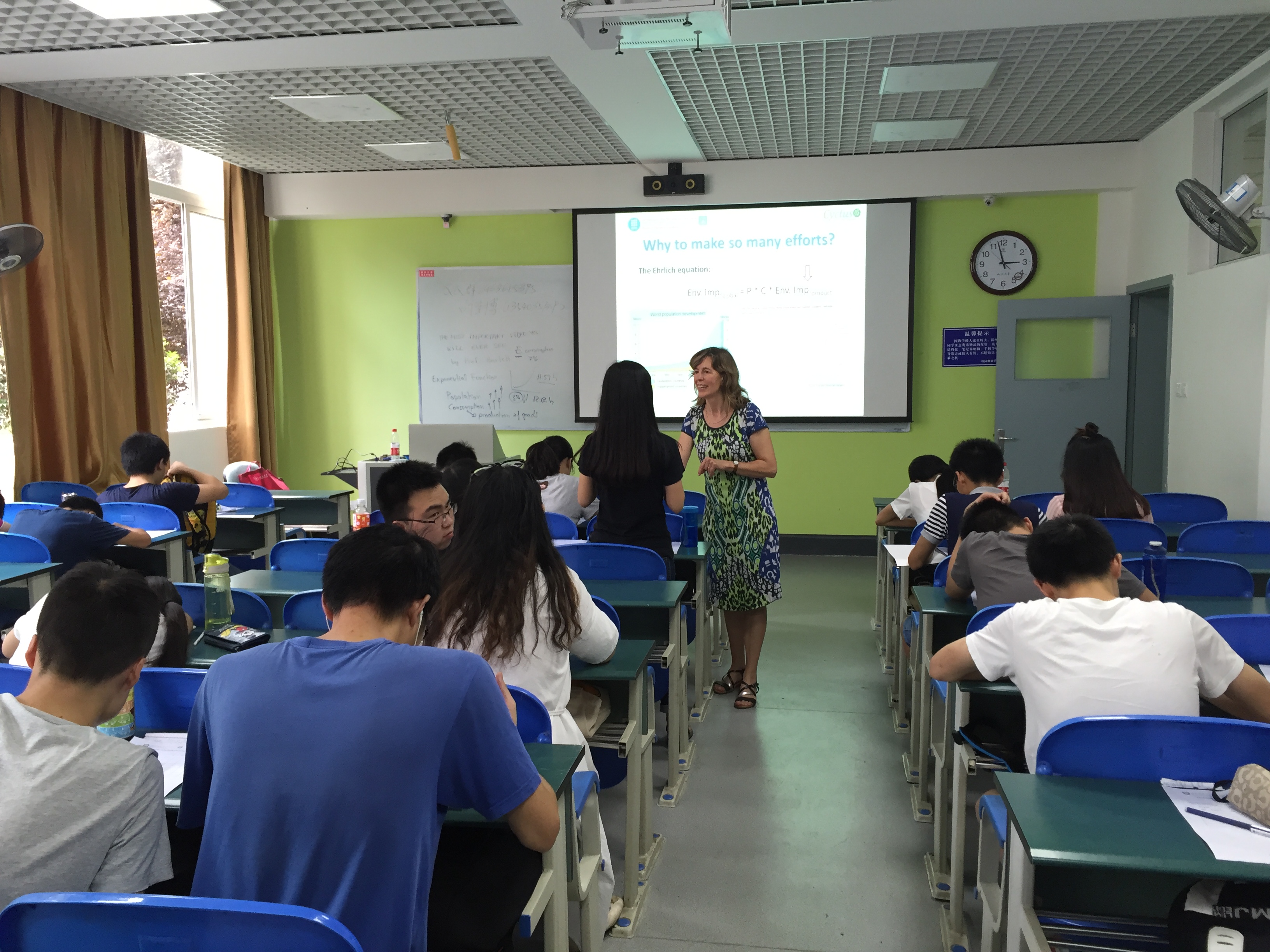 望江校区第三教学楼117讲学。首先,Rita教授为本科生介绍了西班牙加泰罗尼亚理工大学伊瓜拉达工程学院(皮革专业)的概况、校园景色和专业设置,以此增进学生们对该学院教学现状的了解。其次,Rita教授介绍其在国际实践周课程的主要授课内容,将结合自己在化学工程和环境管理、特别是在生命周期评价(LCA)领域的研究,为在座学生讲述环境问题的产生、现状和环境影响的分类与甄别,并将在课程期间重点举例讲授制革工业中环境问题的来源、制革过程中固体废弃物和废水的环境影响现状及其现有解决方案和配套技术。在首堂课程的教学过程中,Rita教授采用视频多媒体,并结合课件与板书,清晰而又生动地围绕“environmental impacts”、“human causes of environmental impacts”和“possible solutions acts we can perform”系列内容,为学生们讲解第一部分“Introduction: sustainability and environmental impacts”中出现的专业名词和环境影响的计算方法。在与学生们的课内外交流中,Rita教授以其亲和而富有耐心的方式,结合多年丰富的教学经验,积极回答学生提出的问题。通过这次“实践及国际课程周”活动,我院本科生对制革过程中的诸多环境问题、现有解决方案与技术和环境影响评估体系将有更为深入的了解。这不仅可以扩充生物质与皮革工程系本科生的专业知识,更可以利用此次活动开阔专业视野,并为复合型人才的培养提供新的教学模式。