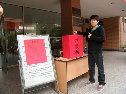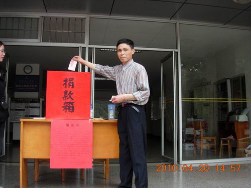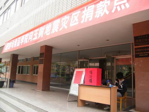 青海省玉树县4月14日凌晨7点49分发生7.1级地震,灾区人民生命财产遭受了不同程度的损失。4月15日校工会向全校教职工发出“为青海省玉树灾区人民捐款、奉献爱心倡议书”,随后我院党委、工会向全体师生发出捐款的倡议,4月20日下午分别在皮革楼和纺工楼前设立了捐款箱。我院师生发扬中华民族“一方有难,八方支援”的传统美德,积极行动向灾区人民伸出援助之手,踊跃捐款。截止23日,我院师生共捐款6342.90元,爱心捐款已由校工会通过省红十字会捐送玉树地震灾区。 捐款现场部分照片: