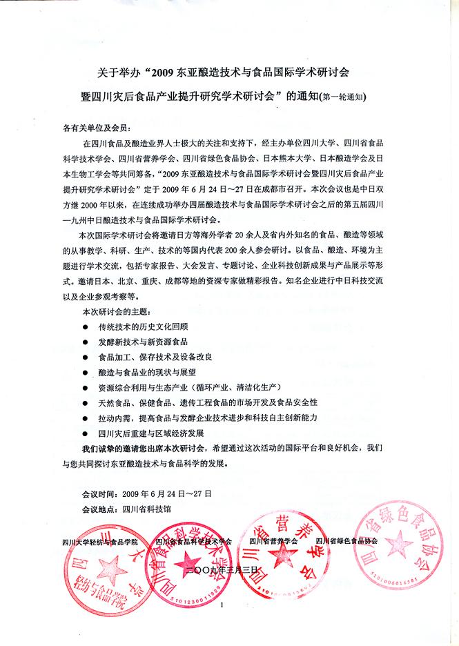 、四川省食品科学技术学会、四川省营养学会、四川省绿色食品协会、日本熊本大学、日本酿造学会及日本生物工学会等共同筹备,“2009东亚酿造技术与食品国际学术研讨会暨四川灾后食品产业提升研究学术研讨会”定于2009年6月24日~27日在成都市召开。本次会议也是中日双方继2000年以来,在连续成功举办四届酿造技术与食品国际学术研讨会之后的第五届四川—九州中日酿造技术与食品国际学术研讨会。本次国际学术研讨会将邀请日方等海外学者20余人及省内外知名的食品、酿造等领域的从事教学、科研、生产、技术的等国内代表200余人参会研讨。以食品、酿造、环境为主题进行学术交流,包括专家报告、大会发言、专题讨论、企业科技创新成果与产品展示等形式。邀请日本、北京、重庆、成都等地的资深专家做精彩报告。知名企业进行中日科技交流以及企业参观考察等。本次研讨会的主题:l 传统技术的历史文化回顾 l 发酵新技术与新资源食品l 食品加工、保存技术及设备改良l 酿造与食品业的现状与展望l 资源综合利用与生态产业(循环产业、清洁化生产)l 天然食品、保健食品、遗传工程食品的市场开发及食品安全性l 拉动内需,提高食品与发酵企业技术进步和科技自主创新能力l 四川灾后重建与区域经济发展我们诚挚的邀请您出席本次研讨会,希望通过这次活动的国际平台和良好机会,我们与您共同探讨东亚酿造技术与食品科学的发展。 会议时间:2009年6月24日~27日会议地点:四川省科技展览馆 NT动漫