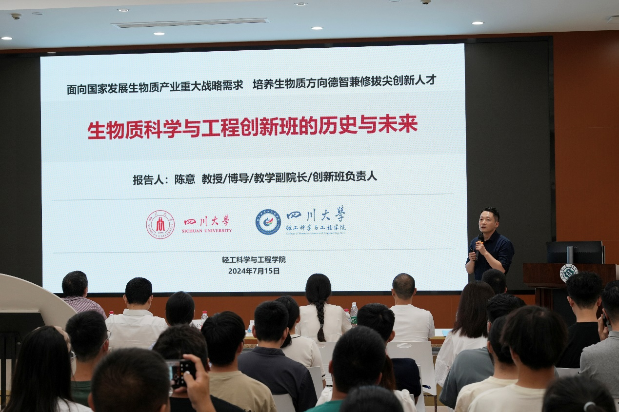 2024�7�15日下午,2023级生物质科学与工程创新班开班仪式在皮革楼工业互联网演播厅隆重举行。参加此次开班仪式的有中国工程院院士石碧教授、学院党委书记李天富、党委副书记冯国涛、院长彭必雨、副院长陈意、迟原龙、周建飞,以及生物质与皮革工程系系主任林炜教授、副系主任程海明教授,还有创新班的导师、班主任及全�2023级创新班学生。开班仪式由冯国涛副书记主持�