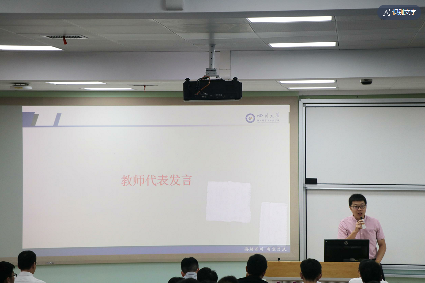 随后,教师代表王亚楠教授发言。王亚楠教授给大家分享了自己在川大的求学生活,同时提出了四点建议:一是保持好奇心和求知欲;二是学会自我管理和时间规划;三是积极参加校园活动与社会实践;四是保持积极乐观的心态。“愿你们怀抱梦想又脚踏实地。”这是王亚楠教授对同学们提出的期许�