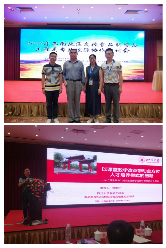 农产品加工研究院名誉院长卢晓黎教授、食品工程系主任吕远平教授、副系主任迟原龙副教授、教研室主任曾维才副教授应邀出席大会,并积极参与了新形势下食品类专业的学科建设、研究生培养、本科教育改革和工程教育专业认证经验的交流和讨论。会上,曾维才副教授做了主题为“以课堂教学改革带动全方位人才培养模式的创新-从课堂革命到国家级教学成果特等奖的川大探索”的报告,现场反响热烈,受到了与会专家的一致好评,极大地扩大了川大食品学科的影响力。