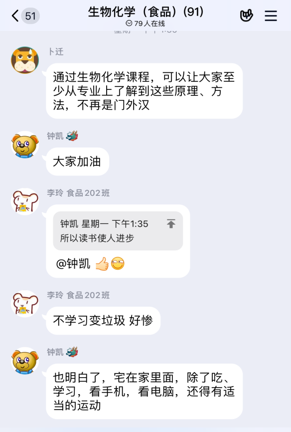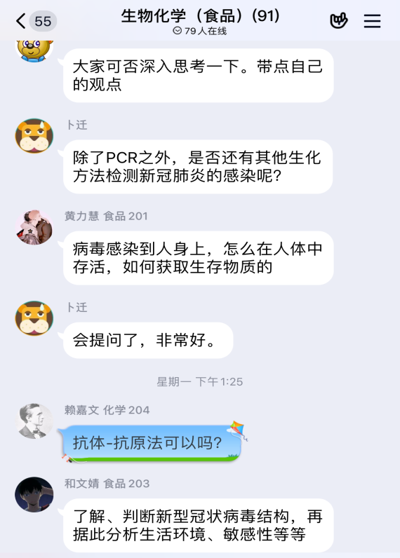 有效启发学生创新思维,不仅是课堂教学肩负的责任,更是当下亟待解决的难题。任课教师们把当前的社会热点有效融入授课内容,通过深挖热点现象与专业知识之间的联系,引导学生积极拓展思维空间。《食品生物化学》任课教师钟凯副教授、卜迁副研究员依�MOOC和腾讯课堂,在课程内容中融合新冠病毒的相关知识,引导学生打开思考的阀门,激发学生的学习兴趣和对专业的认可度�