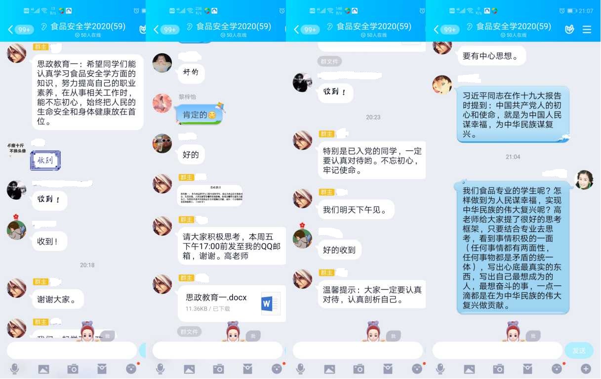 在《食品安全学》的整个教学过程中,学生们课上积极讨论问题,课后积极提交思政教育相关作业,达成专业技能培养和思政教育的协同推进。我院将继续打造包含《食品安全学》在内的课程思政榜样课程,充分发挥榜样课程体系在提升人才培养成效中的重要作用,努力实现培养具有崇高理想信念、深厚人文底蕴、扎实专业知识、强烈创新意识、宽广国际视野的新时代育人目标。