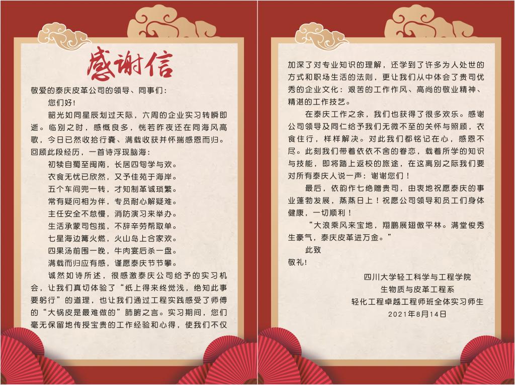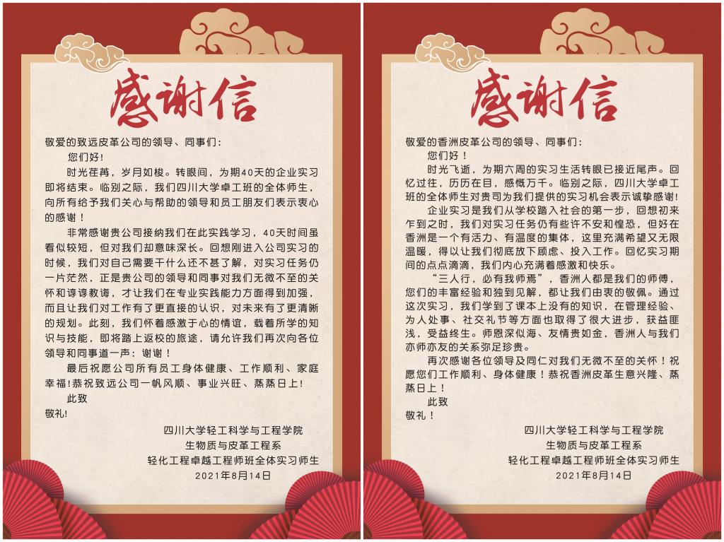 最后,感谢漳州香洲皮革有限公司、福建泰庆皮革有限公司、漳浦致远皮革有限公司和四川德赛尔化工实业有限公司对川大轻化工程专业本科教学和企业实习工作的大力支持!