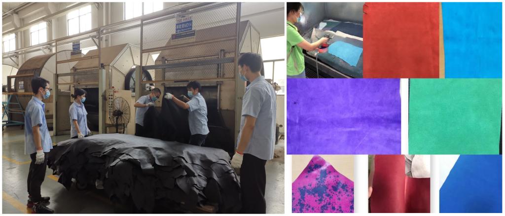 在福建泰庆皮革有限公司实习的学生,先在水场和干整理车间分别进行了为期2周的现场学习,在车间主任、各工段技术负责人以及一线操作工人的指导下认识鞋面革生产流程和控制要点,并在摔软、涂饰等工序进行了实践。最后2周学生进入技术开发中心,首先根据工程师提供的工艺方案完成了实验样品的制备,然后再自行设计研发了三种风格的皮革产品,经过实习学生的反复尝试,最终得到的皮革品质超出预期,充分体现了实习劳动的创新性成果。