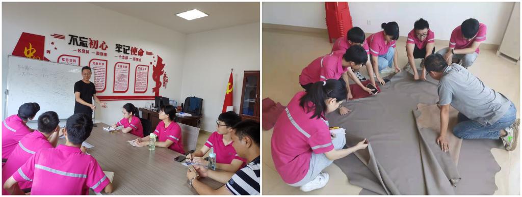 根据企业实习计划安排,24名同学分成4个小队,分别在漳州香洲皮革有限公司(6人)、福建泰庆皮革有限公司(11人)、漳浦致远皮革有限公司(6人)和四川德赛尔化工实业有限公司(1人)进行为期6周的实习。根据实习大纲的要求,相关实习环节包括学生在不同工作岗位动手实操、企业导师实地指导、专家经验座谈、企业参观交流、安全防火演练等。