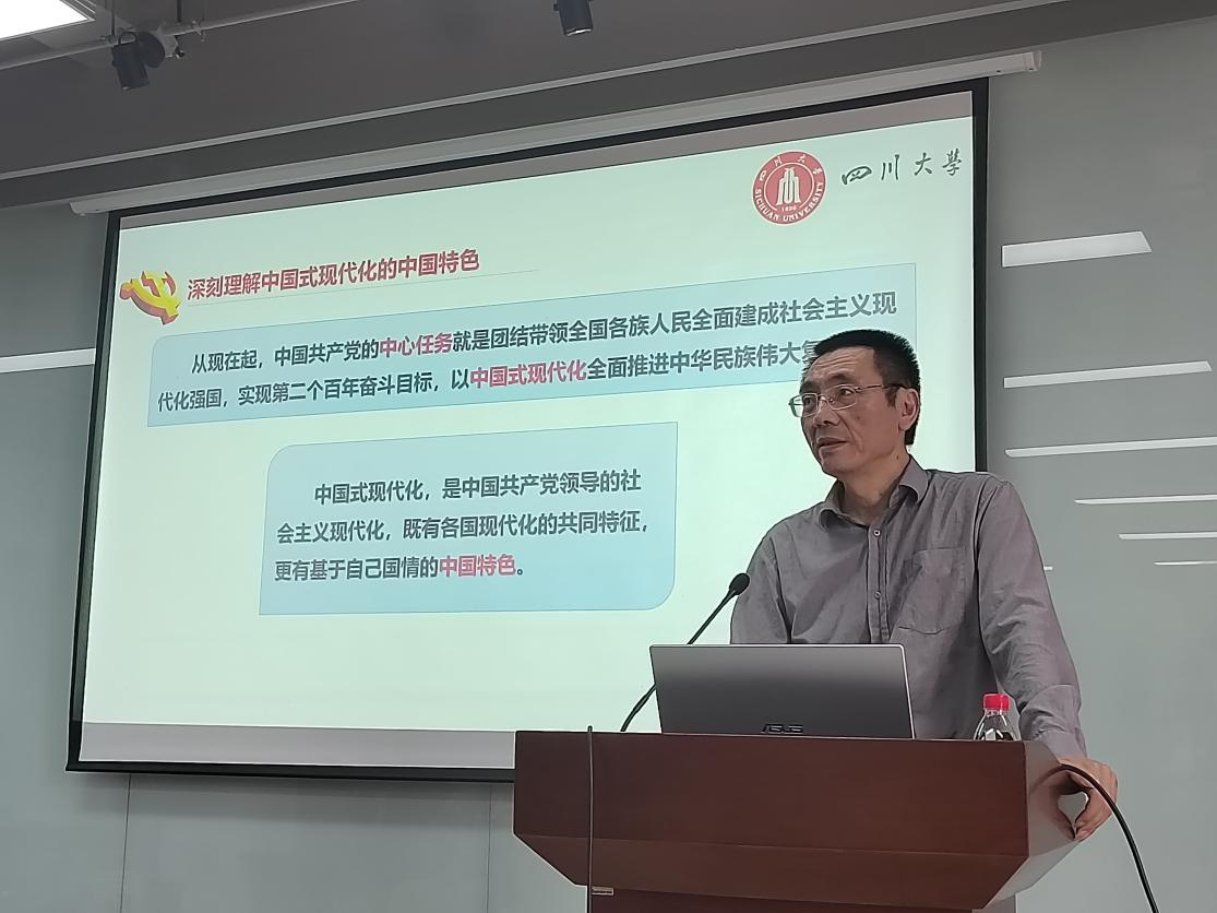 蒋永穆教授聚焦本次主题教育核心,作了题为《以中国式现代化推进中华民族伟大复兴》的专题辅导报告。报告从深刻理解中国式现代化的中国特色和以中国式现代化推进中华民族伟大复兴两方面进行生动讲解。蒋教授指出,中国式现代化,是中国共产党领导的社会主义现代化,既有各国现代化的共同特征,更有基于自己国情的中国特色。中国共产党的中心任务就是团结带领全国各族人民全面建成社会主义现代化强国,实现第二个百年奋斗目标,以中国式现代化全面推进中华民族伟大复兴。