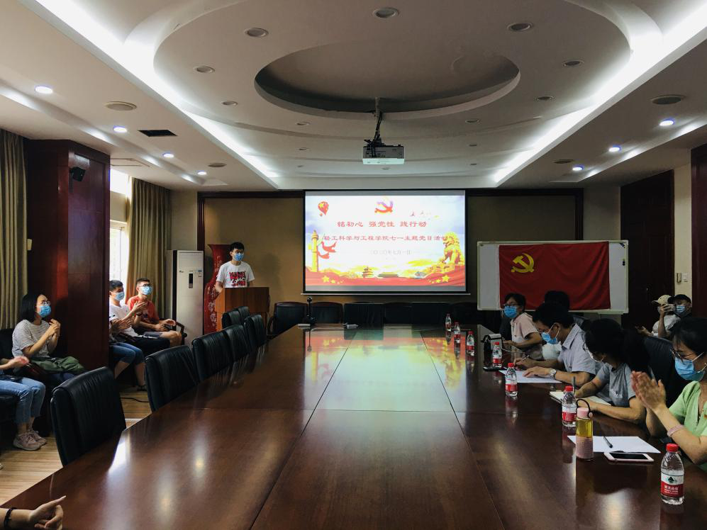 为热烈庆祝中国共产党成立99周年,认真落实“四个一”行动方案,轻工科学与工程学院学生党支部�2020�7�1日晚在皮革楼209会议室隆重举行“铭初心、强党性、践行动”七一主题党日活动。本次主题党日活动采取线上线下相结合的方式进行,学院党委副书记冯国涛老师、学生事务办公室主任贺婷老师�016级本科生党支部书记王舒灏老师�017级本科生党支部书记杨维老师以及研究生党支部指导教师李晓秀老师及各支部党员代表参加了线下活动,其余学生党员均通过云端参会,主题活动由杨恒同志主持�
