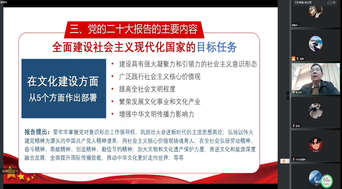 首先,彭必雨院长从党的二十大重要意义、重要任务、党的二十大报告主要内容三方面向同学们全面介绍了党的二十大精神,并对国家在科教人才方面四个部署进行重点解读。党的二十大报告指出,教育、科技、人才是全面建设社会主义现代化国家的基础性、战略性支撑。必须坚持科技是第一生产力、人才是第一资源、创新是第一动力,深入实施科教兴国战略、人才强国战略、创新驱动发展战略,要坚持教育优先发展、科技自立自强、人才引领驱动,加快建设教育强国、科技强国、人才强国,坚持为党育人、为国育才,全面提高人才自主培养质量,着力造就拔尖创新人才,聚天下英才而用之。