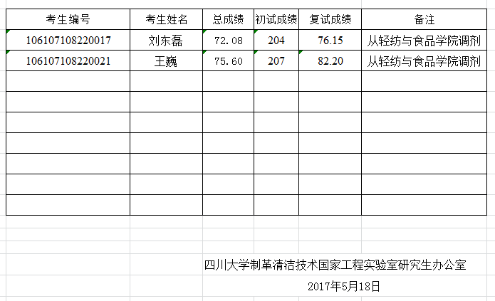 现将制革清洁技术国家工程实验室2017年博士研究生招生入学成绩进行公示。如有问题或意见,自公示之日起十个工作日内,实名制反映至轻纺与食品学院纪委办公室。邮箱[email protected],联系电话85461730。此名单不包括非公开招考考生。