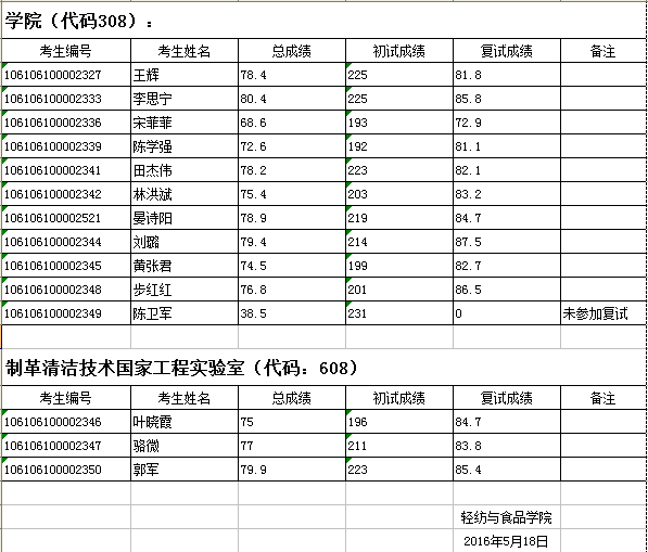 现将轻纺与食品学院2016年博士研究生招生入学成绩进行公示。如有问题或意见,自公示之日起三个工作日内,实名制反映至轻纺与食品学院纪委办公室。邮箱[email protected],联系电话85461730。此名单不包括3+2+3学生、硕博连读学生和三年级转博学生。