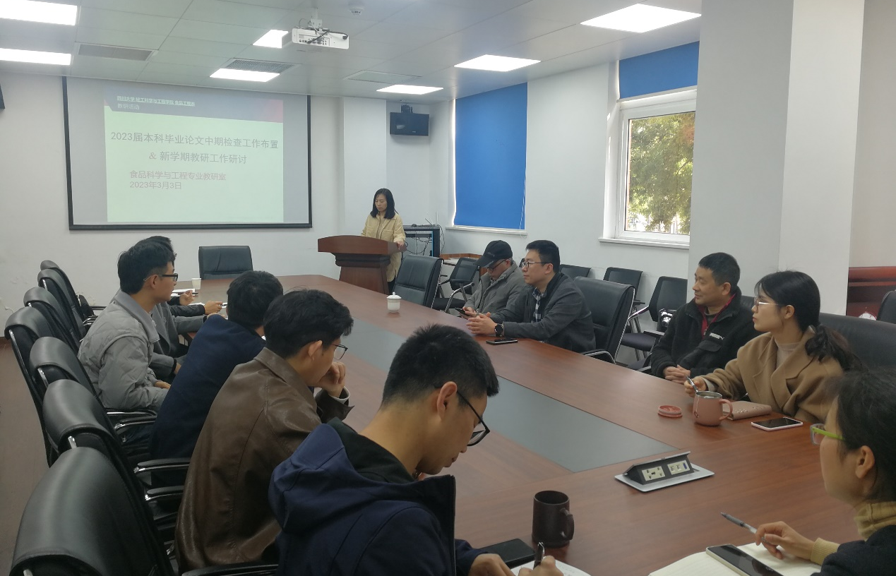 本科毕业论文(设计)管理办法(修订)》川大教〔2022〕56号文件,进行了解读,对本科毕业设计(论文)指导、撰写、评阅过程中的常见问题进行了梳理和解答,进一步明确了食品科学与工程专业2019级本科毕业设计(论文)工作推进的时间节点,并就新学期教研工作的开展进行了布置。本次活动对于新学期教学工作的有序开展具有重要意义。