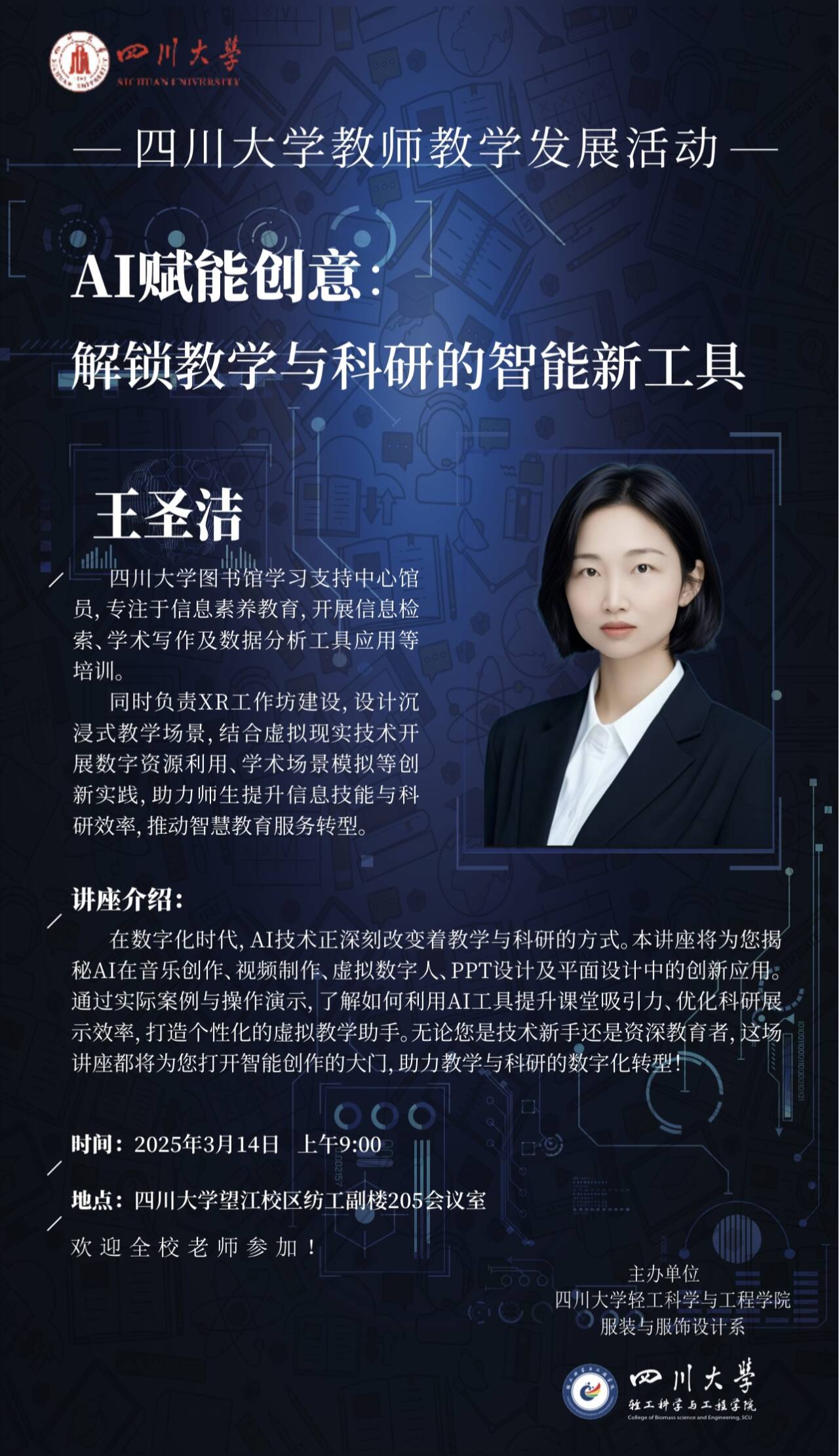 望江校区纺工附楼205会议室开展了主题为 “AI赋能创意:解锁教学与科研的智能新工具”的教师教学能力提升活动。服装与服饰设计系全体教师参加了此次活动,系主任杨璐铭教授主持讲座。