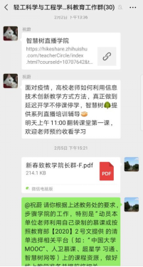 学院各教研室积极动员,组织教师参加线上授课培训,并开展了爱课堂、学习通、智慧树等平台的运用研讨。按照校院两级的既定工作方案,认真细致地开展线上授课准备工作,包括MOOC资源的引入、课�QQ群或微信群的组建、课程日历调整、课件准备等。截止于2�23日,各课程群已完成选课学生及学院督导人员入群、上传学习资料等工作�