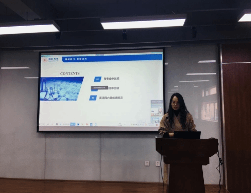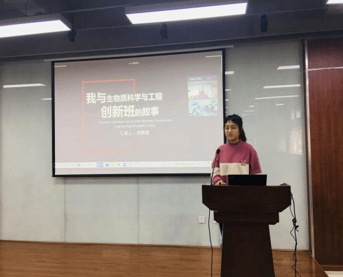 来自2018级轻化工程专业侯静雯同学从人生初理想、走过的那些路、所得与所悟、未来的小目标四个方面向与会人员真挚分享了与创新班的故事。最后,侯静雯同学以“不倒翁”精神与同学们共勉,号召大家保持自信和微笑,遇见更好的自己。