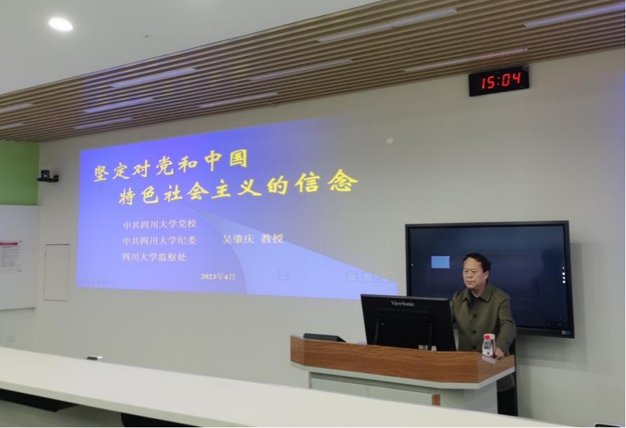 吴肇庆老师以“坚定对党和中国特色社会主义的信念” 为主题向学员们讲授了专题党课。首先,吴肇庆教授以生动的党史故事来说明对党的信念的理论、历史、现实和情感等问题,带领学员们理解、掌握对党的信念的内涵,从而树立科学信念。吴教授讲述了朱德元帅、周恩来总理、陈毅元帅等革命先辈的先进事例,阐述了当代青年树立对党的信念的重要性,指明当今时代入党应特别解决好对党的信念问题,老一辈共产党人对党的坚定信念是“不忘初心,牢记使命”的典型,是我们学习的榜样。其次,吴肇庆教授还通过分析当今国际局势以及国际敌对势力的西化分化与遏制战略,指出在这个文化多元化、价值观和信仰多样化的时代,坚定对党的信念是党的执政地位和国内外形势的要求,应在全面认识党的领导体制和“四个自信”中坚定对党的信念,阐述坚定对党的信念的必要性。最后,吴肇庆教授强调当代青年应在学习与实践中国坚定对党和中国特色社会主义的信念,要学习好和坚持好习近平新时代中国特色社会主义思想,树立对党的信念,为中华民族的崛起而努力。