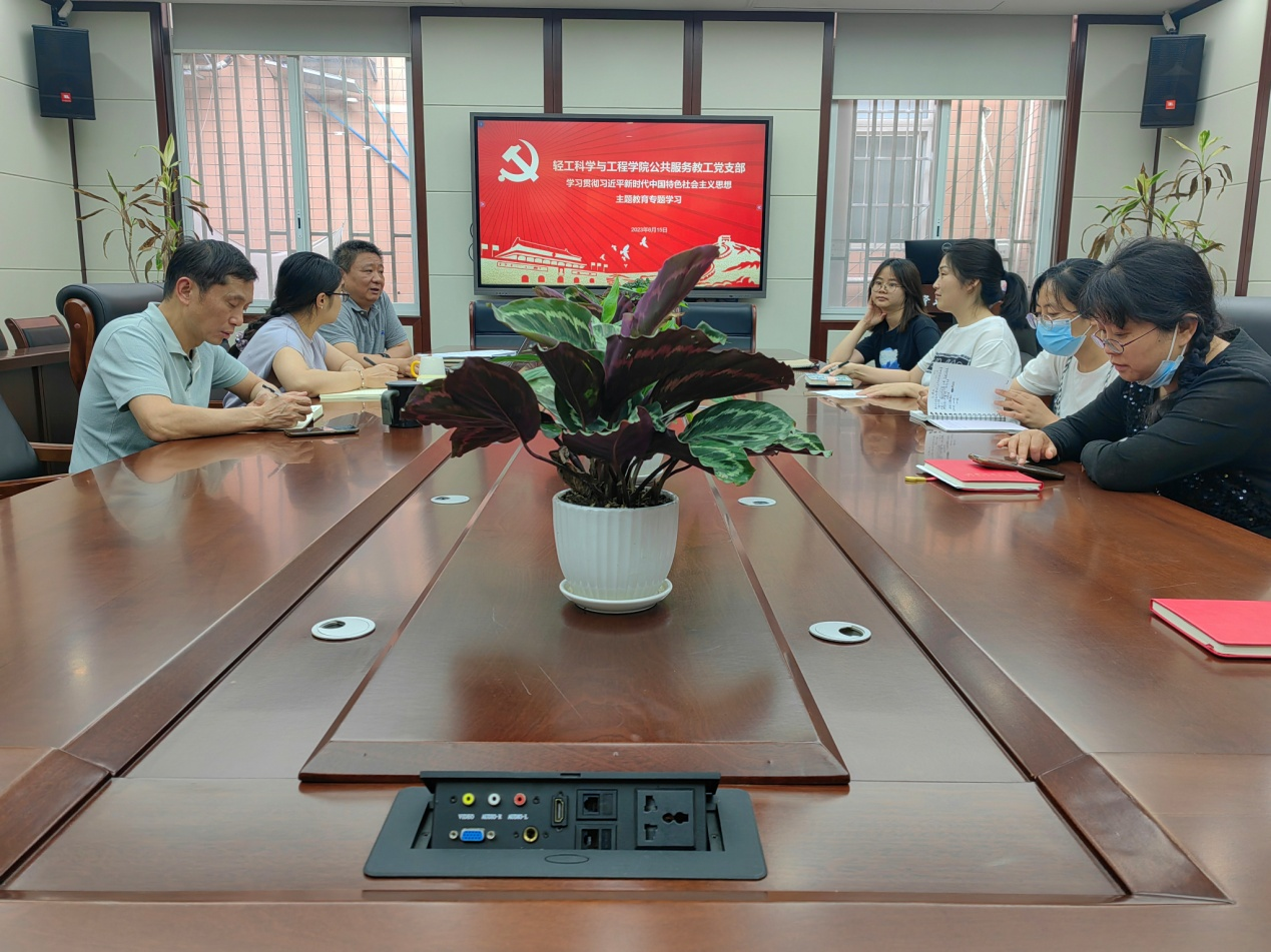 2023�6�15日下午,公共服务教工党支部在纺工附楼205会议�开展学习贯彻习近平新时代中国特色社会主义思想主题教育专题学习,支部全体党员参加了此次会议�