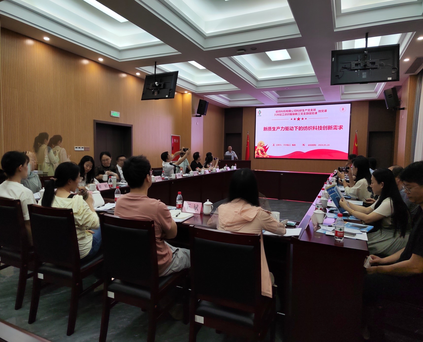随后,在纺科院行政办公楼第一会议室,开展了主题党日学习和交流活动。省纺科院党委书记马德武致欢迎词,介绍了纺科院的历史沿革及发展情况,并表示,在当今快速变革的市场环境中,企业要抓住机遇,抢抓科技创新的脉搏,以人才为基础,以技术创新为动力,推动新材料和工艺技术的转化和应用,为行业注入新活力,实现纺织行业的跨越式发展。纺织服装教工党支部书记陈胜为省纺科院对此次主题党日活动的支持表示感谢,并简要介绍了我院纺织服装教工党支部的组成和教学科研等方面的基本情况。随后,陈胜书记与樊武厚书记分别以“新质生产力驱动下的纺织科技创新需求”和“以发展新质生产力为引领,推动四川纺织行业高质量发展”为主题进行了党课讲授,深入讲解了新质生产力的内涵、特点和时代意义,以及如何利用新质生产力推动纺织行业的高科技创新和产业升级,实现纺织产业的高质量、可持续发展目标�