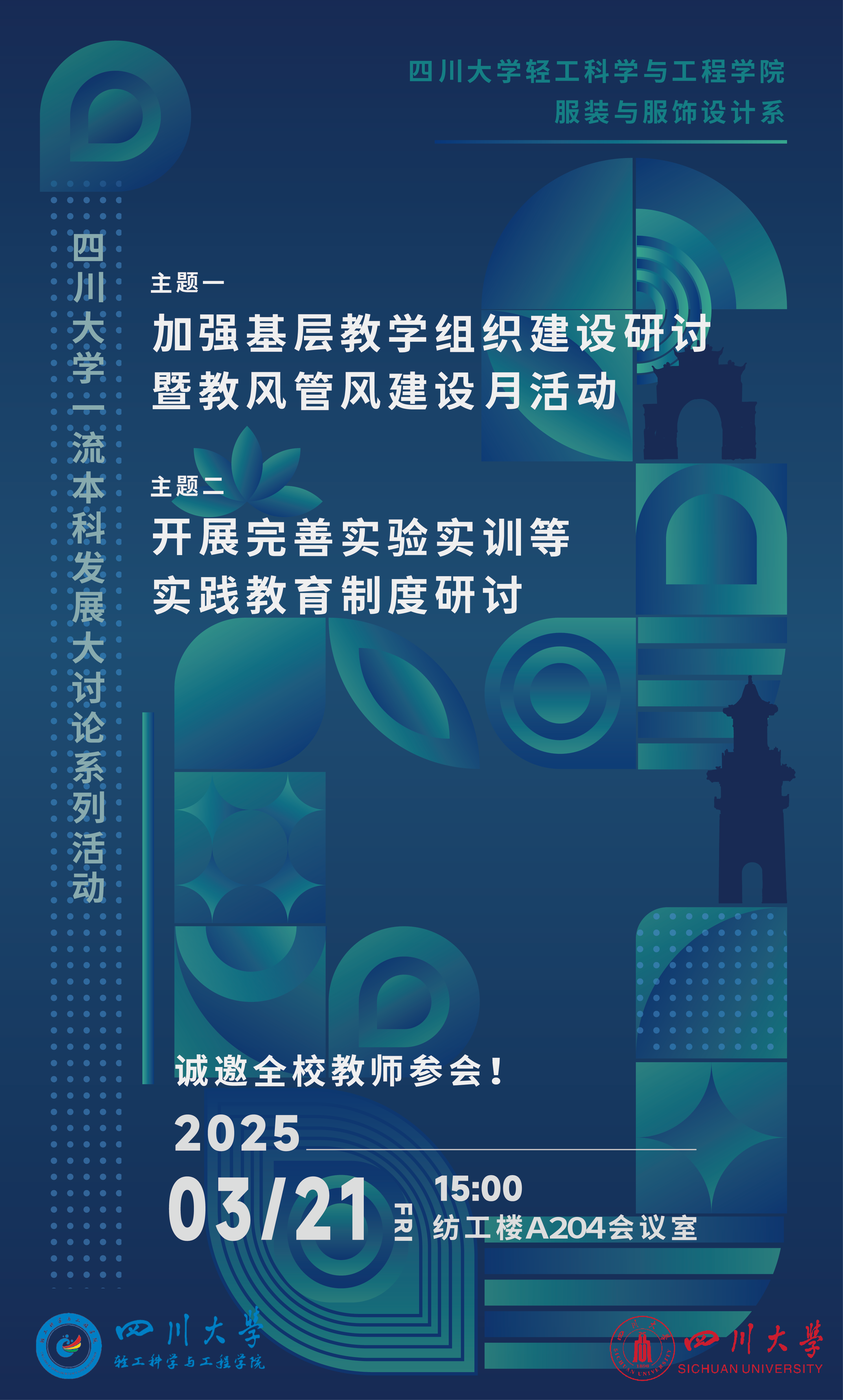 为全面贯彻习近平总书记关于教育工作的重要论述,锚定2035年教育强国建设目标,共同答好“教育强国,川大何为,一流本科何为”的重要命题, 2025年3月21日下午,服装与服饰设计系在纺工楼A204会议室组织全体教师,围绕“加强基层教学组织建设研讨暨教风管风建设月”、“完善实验实习实训等实践教育制度”两大主题展开了研讨。本次研讨邀请到院长彭必雨参会,会议由副系主任申鸿主持。